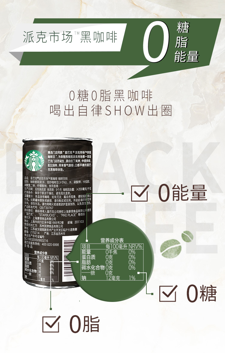 这款星巴克即饮黑咖啡,精选门店同款“派克市场”烘焙咖啡豆,咖啡香气馥郁突出,口感均衡,入口微苦,回味甘醇。0糖、0脂、0卡路里,好喝不胖。