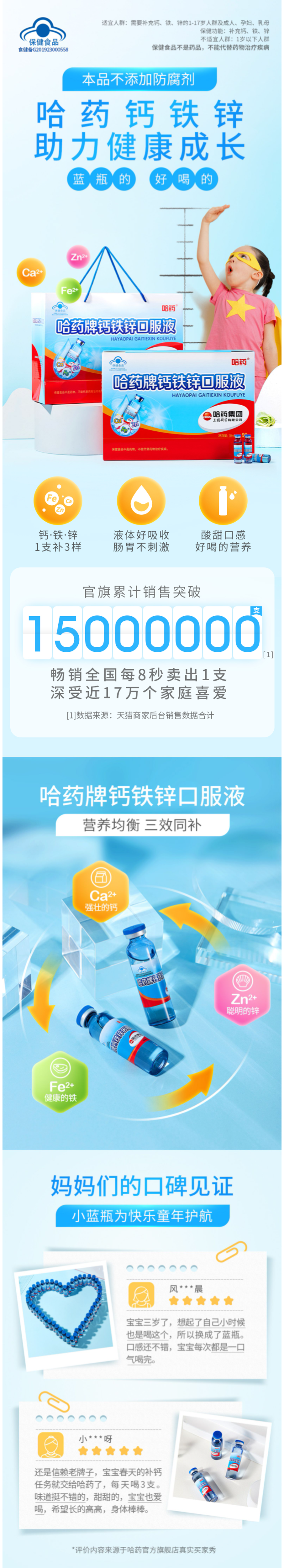 哈药知名品牌实力保障,多年口碑的钙锌同补保健品,还记得经典广告语“蓝瓶的,好喝的!”