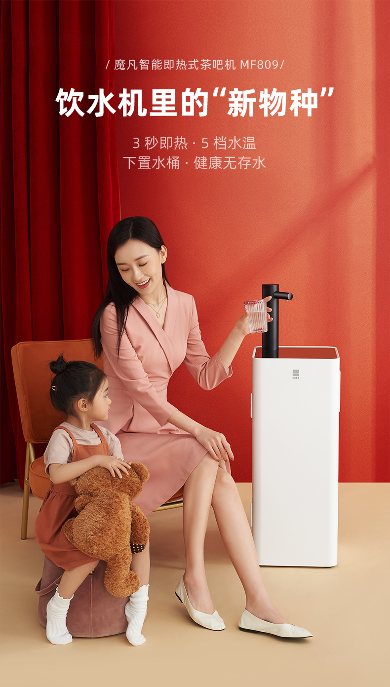 这款魔凡MF809-A全自动即热式饮水机,双层一体设计,极简外观,集约功能。一键热饮无需等待,只需3秒速热,使用无内胆加热,健康无存水。