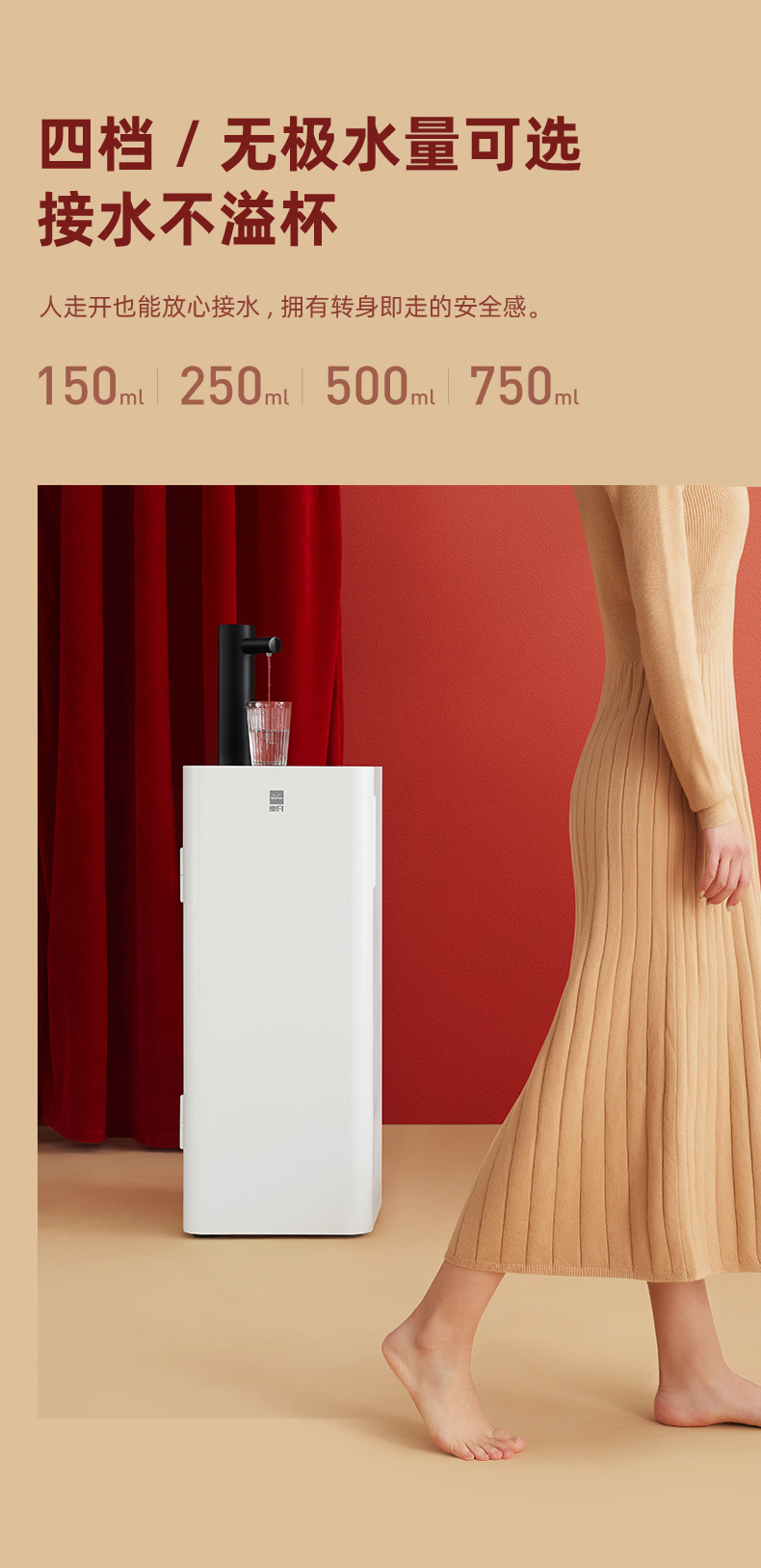 拥有出水流量智能感应水温功能,选择出水温度越低,出水流量越大,节省等待时间。四档/无极水量可选,人走开也能放心接水,不用担心会溢杯。150ml、250ml、500ml、750ml。
