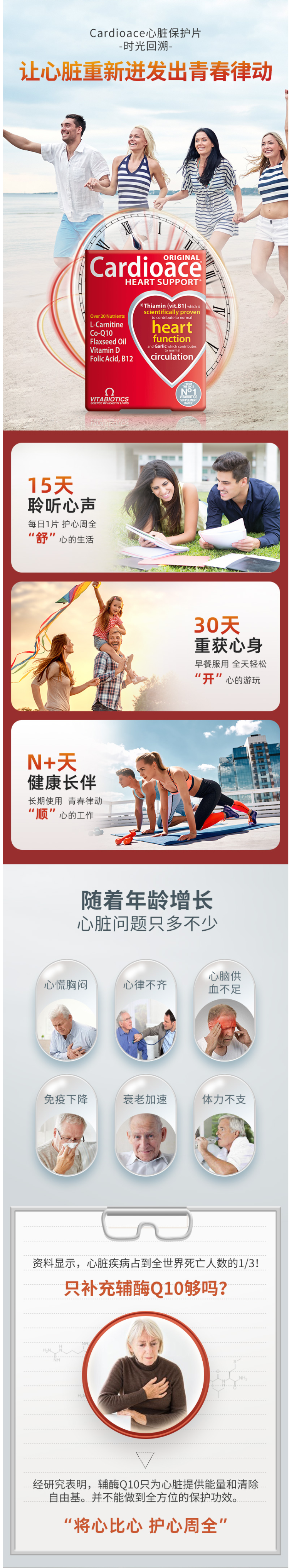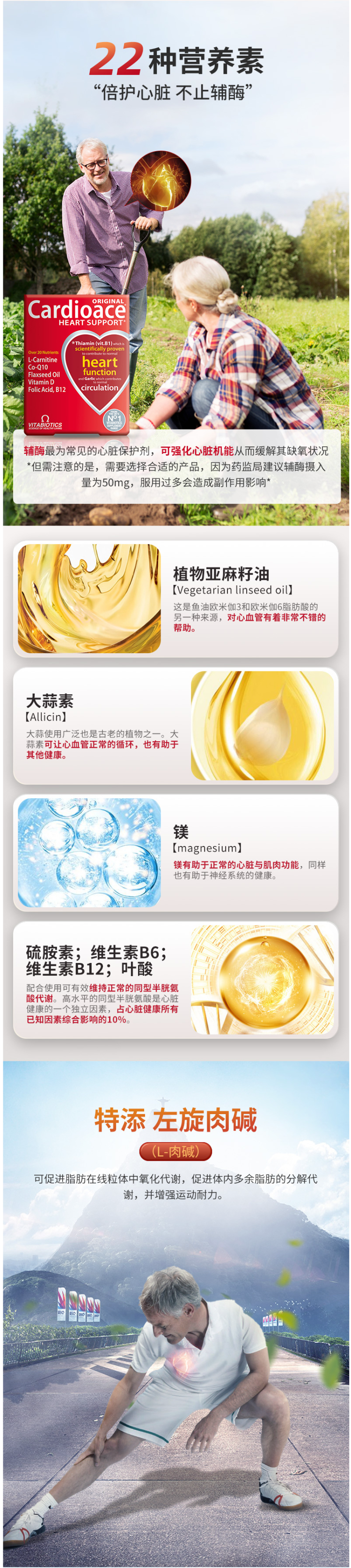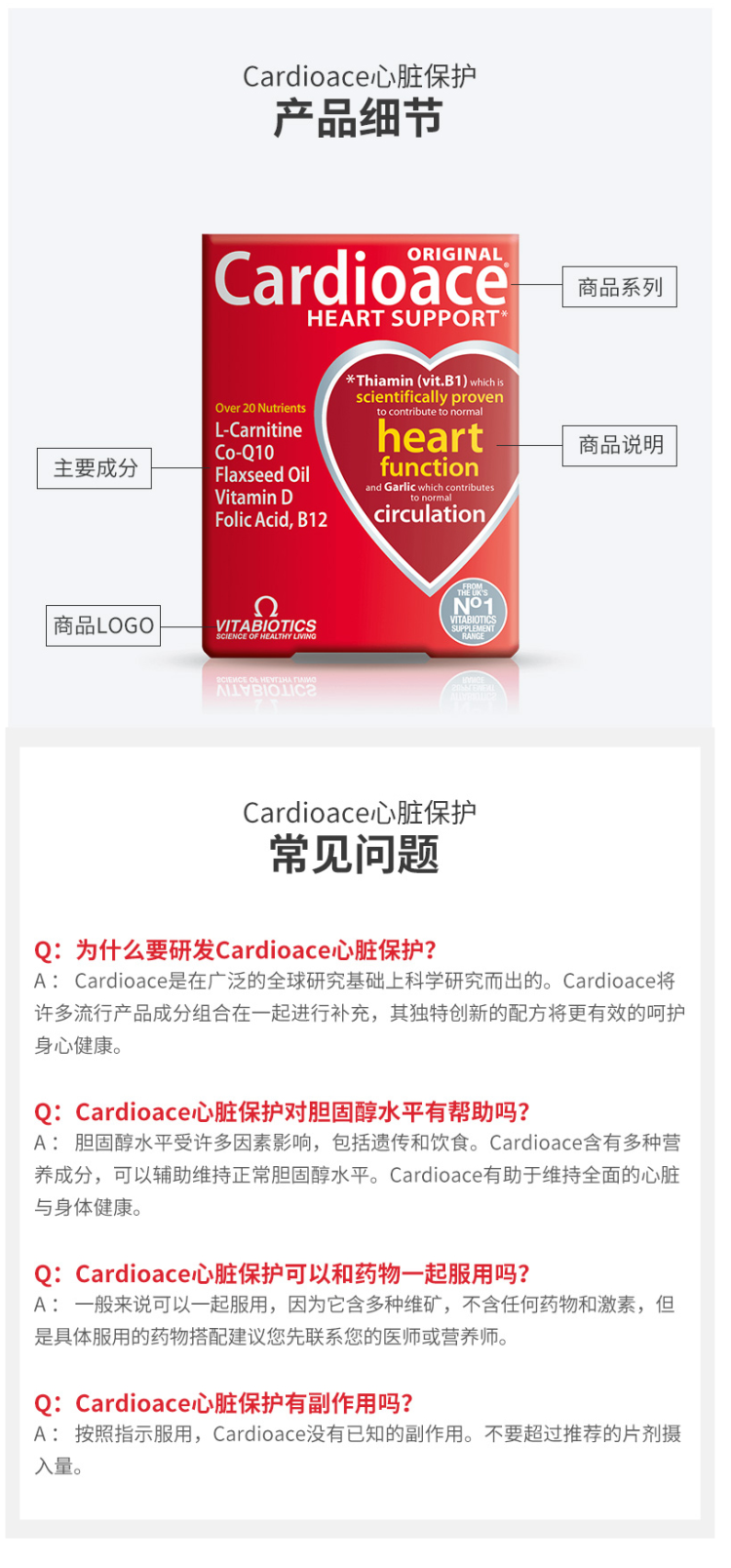 这款维百莱旗下Cardioace辅酶Q10,英国原装进口,使用复合配方,全方面呵护心脏。主要成分是辅酶Q10、植物亚麻籽油、大蒜素、镁、硫胺素、维生素B6、维生素B12、叶酸等22种营养元素,除了呵护心脏,同时呵护全身健康。