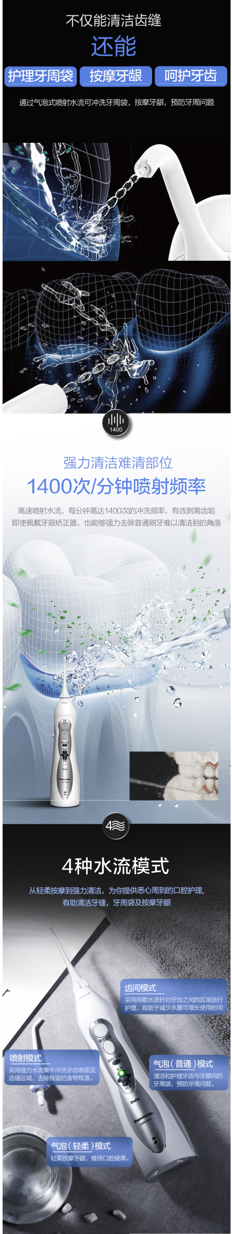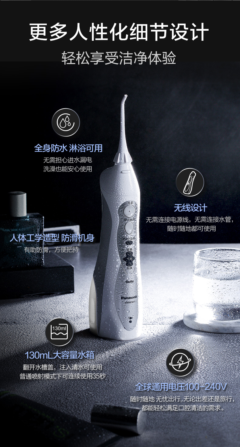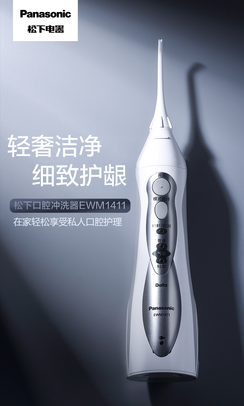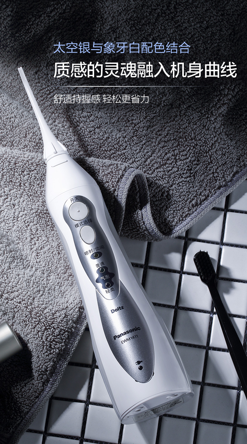 刚开始使用的时候,建议使用轻柔档,松下 EW-1411 便携冲牙器,通过高频脉冲水线,祛除牙齿和齿间的食物残渣,达到改善口腔环境、清除口腔炎症,预防牙结石的目的。还具备普通洗牙器没有的独创气泡水流,在水流中注入空气,不仅能清洁,还能起到按摩和护理牙龈的作用。