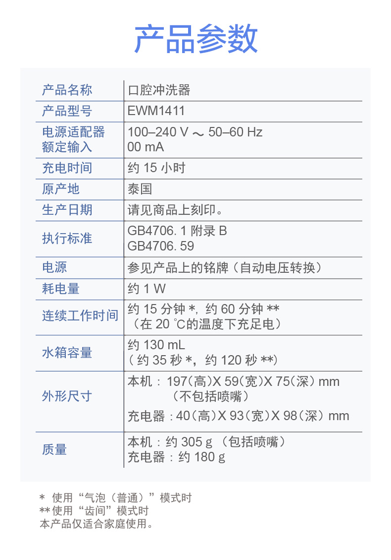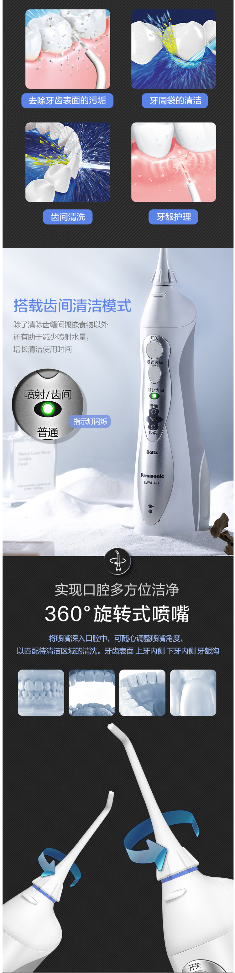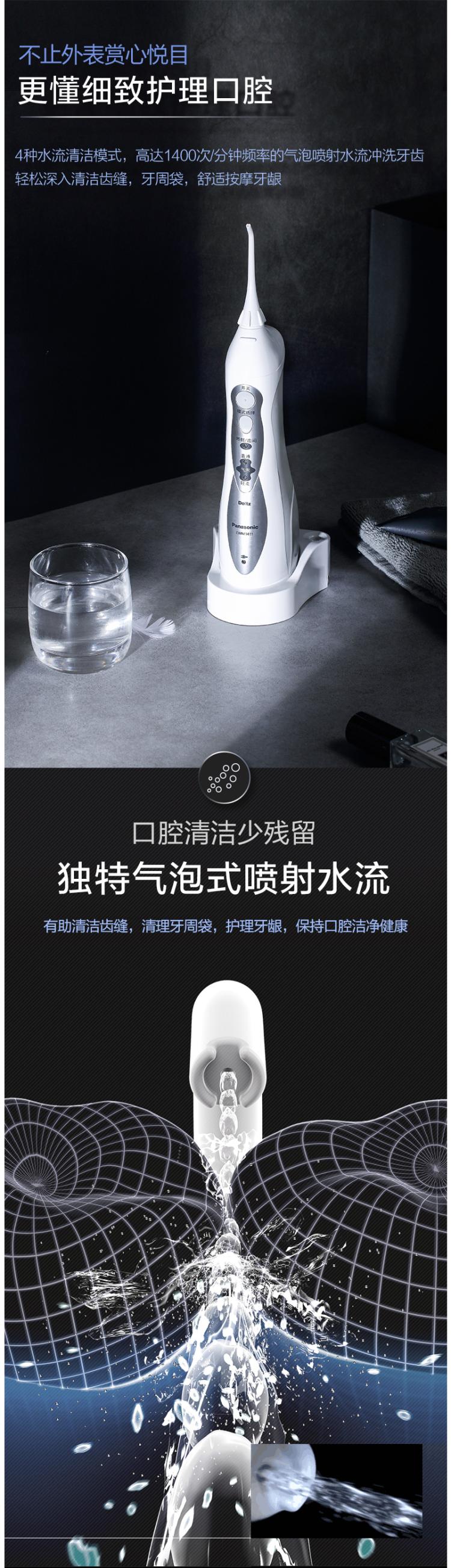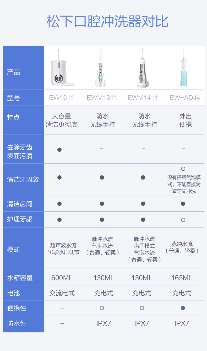 刚开始使用的时候,建议使用轻柔档,松下 EW-1411 便携冲牙器,通过高频脉冲水线,祛除牙齿和齿间的食物残渣,达到改善口腔环境、清除口腔炎症,预防牙结石的目的。还具备普通洗牙器没有的独创气泡水流,在水流中注入空气,不仅能清洁,还能起到按摩和护理牙龈的作用。