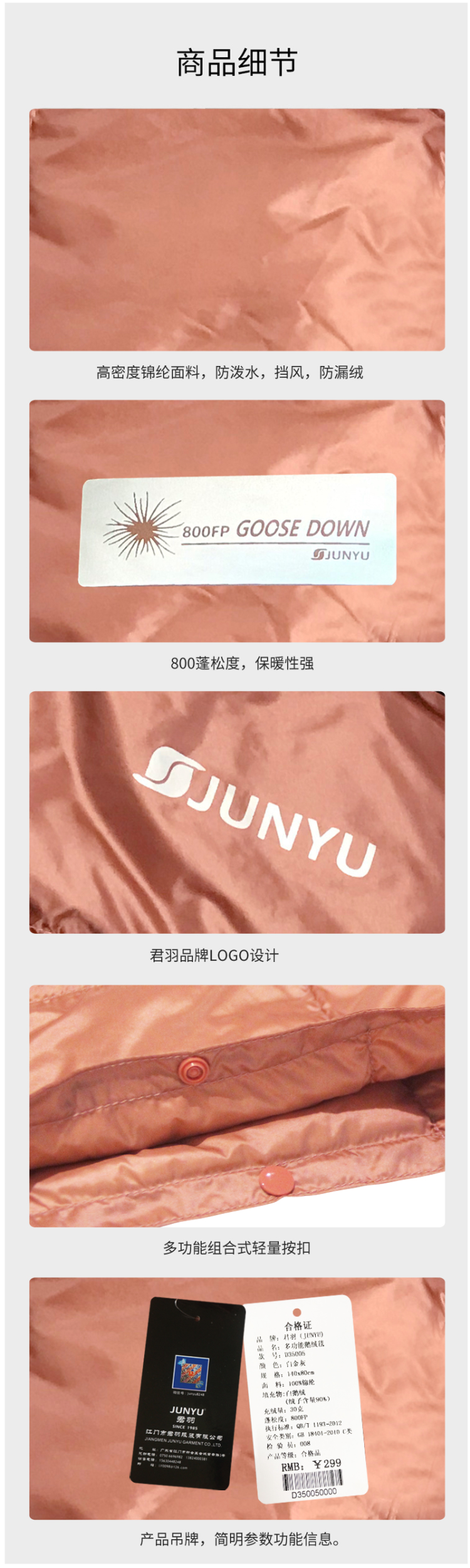 「鹅绒」800蓬鹅绒成本约是普通鸭绒的10倍,没有鸭毛的腥味,保暖效果更好;「30克 800蓬鹅绒」≈「38克 700蓬普通鹅绒」≈「55克普通鸭绒」。
