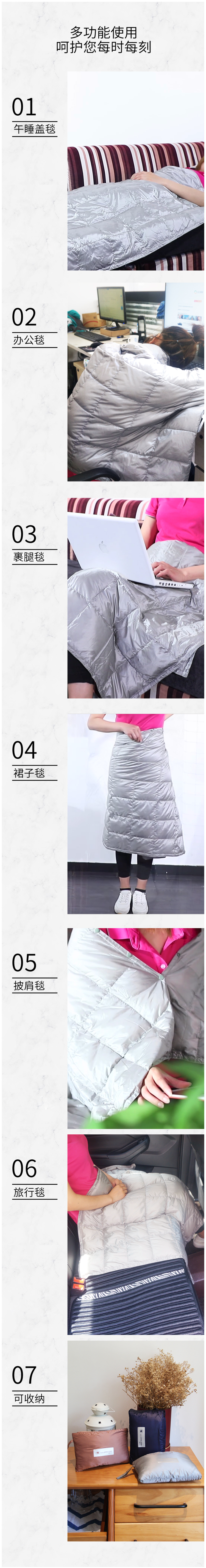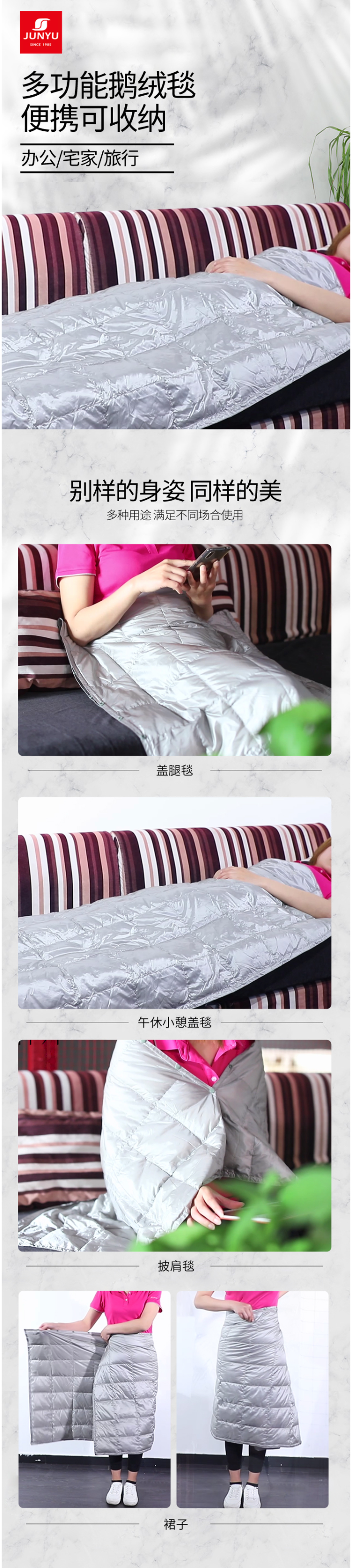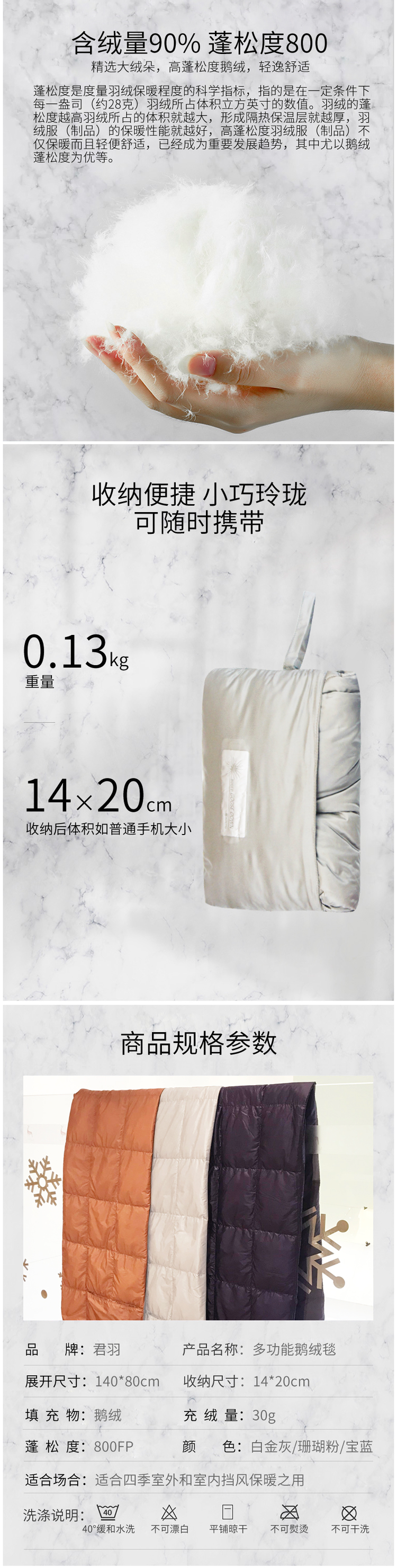 这款君羽羽绒毯,内里填充了800蓬90%鹅绒,充绒量为30克,可以轻易收纳成小手袋形状,尺寸是14*20cm,仅重0.13kg,非常便于携带。展开后是的尺寸是140*80cm,可以作为披肩毯、午休小憩盖毯、盖腿毯。