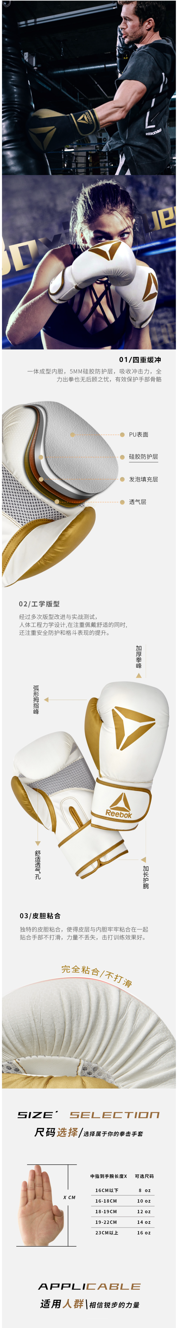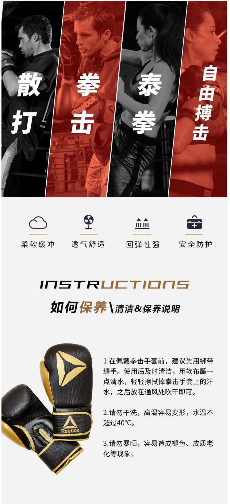 这款锐步Reebok 专业拳击手套,由PU表面、硅胶防护层、发泡填充层、透气层组成,拥有四重缓冲,一体成型内胆、5MM硅胶防护层,能很好的吸收冲击力,全力出拳也无后顾之忧,有效保护手部骨骼。