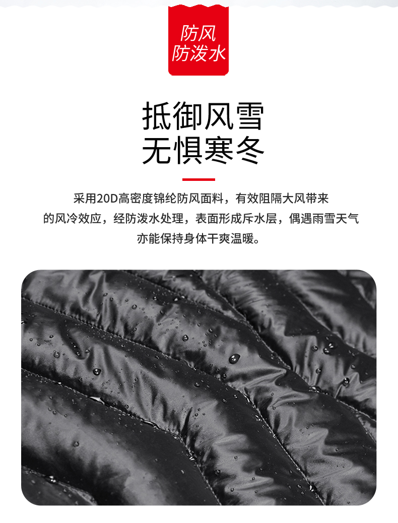 面料:采用日本东丽的20D防泼水,这种面料最大的特点就是,很轻薄、防水、挡风、防漏绒。