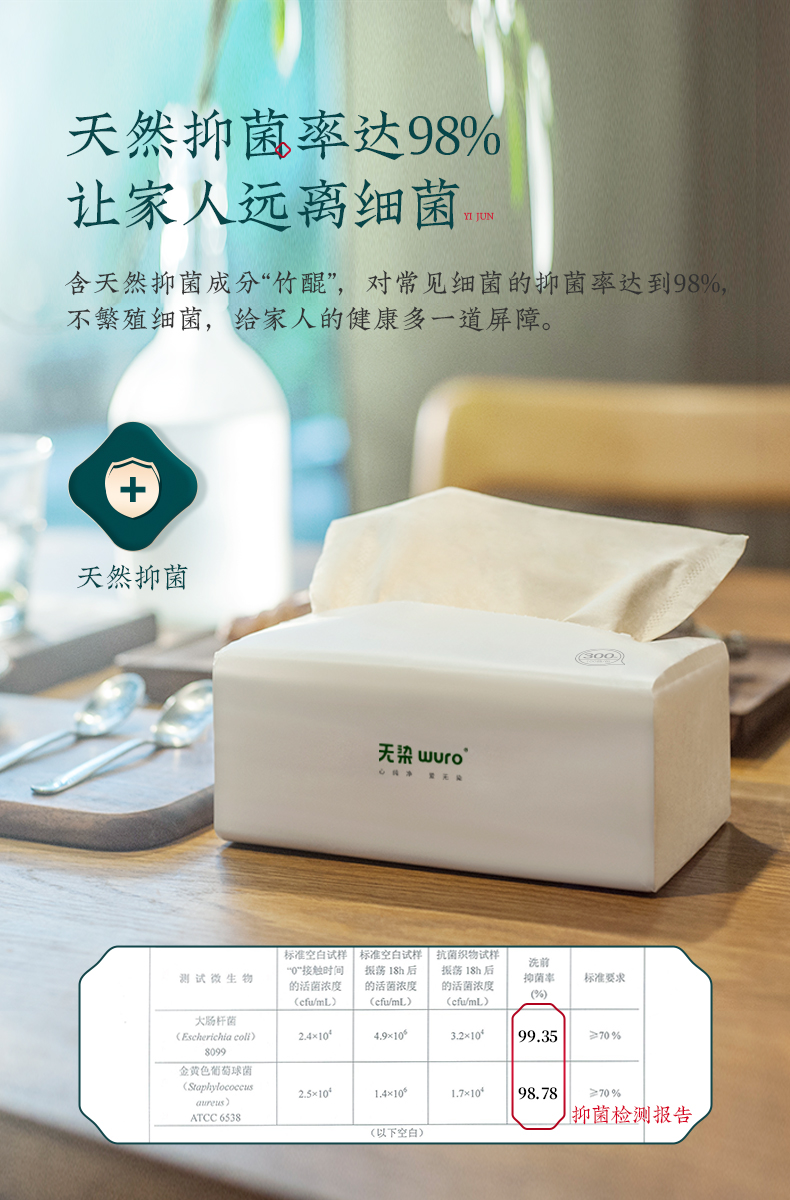 这款抽纸无漂白,无有害添加,抽纸可直接接触食品,内部添加天然提取的竹锟精华,抑菌率高达99%,具有多孔纤维,可以瞬间吸收和蒸发水分,湿水后韧性更强,擦拭后不易松散,干湿两用,大小适中。