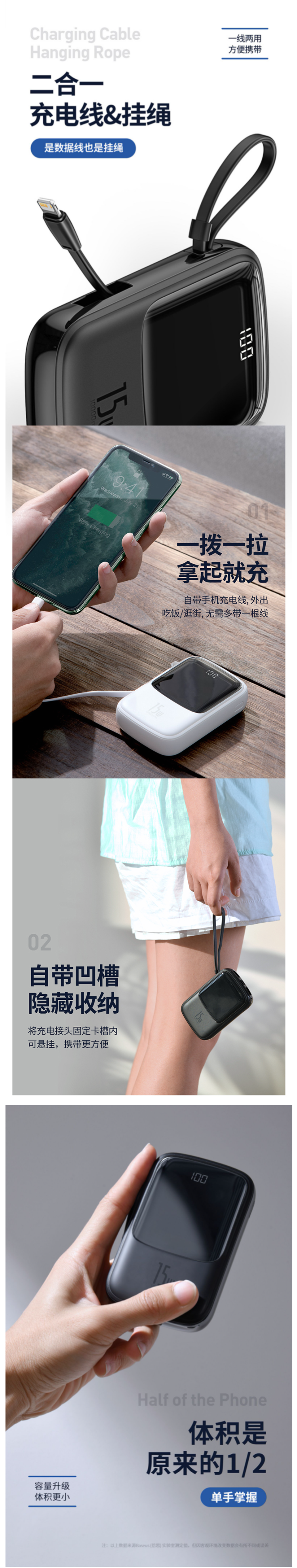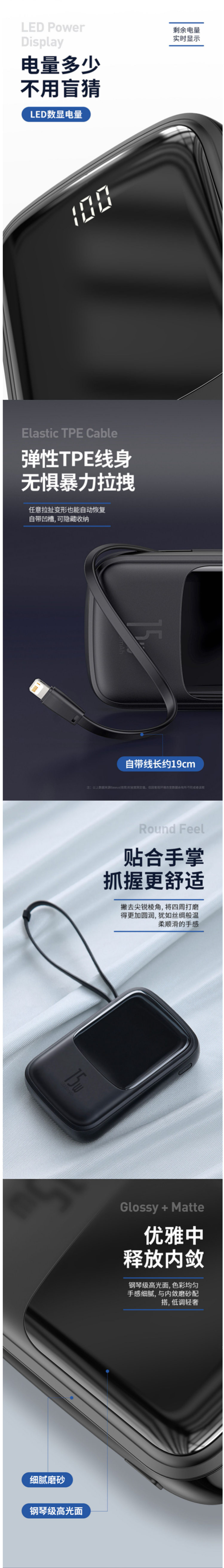 这款倍思Q电小巧便携充电宝,容量是10000mAh,尺寸:105*67*25mm,小巧便携。双输入+四输出的组合,充电协议pd2.0,剩余电量实时显示。弹性TPE线身,最长19cm,无惧暴力拉拽,自带凹槽,利于隐藏收纳。