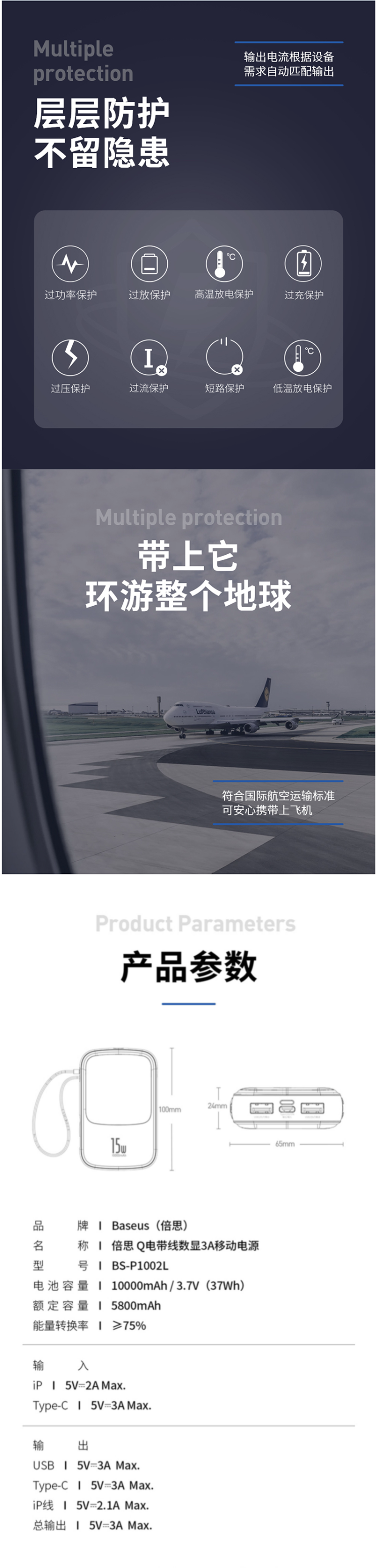 在安全上,拥有过功率保护、过防保护、高温放电保护、过充保护、过压保护、过流保护、短路保护、低温放电保护。符合国际航空运输标准,可安心携带上飞机。