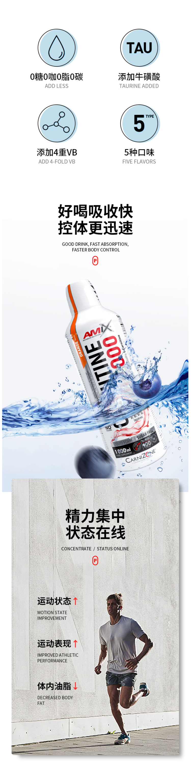 每10ml含有1000mg左旋肉碱,纯度高达99.99%,同时人体的吸收率也达99%,0糖分,0热量,0咖啡因。维生素B族协助脂肪在线粒体中分解燃烧;牛磺酸,加速清除自由基,有效抗击运动酸痛,提升人体免疫力。