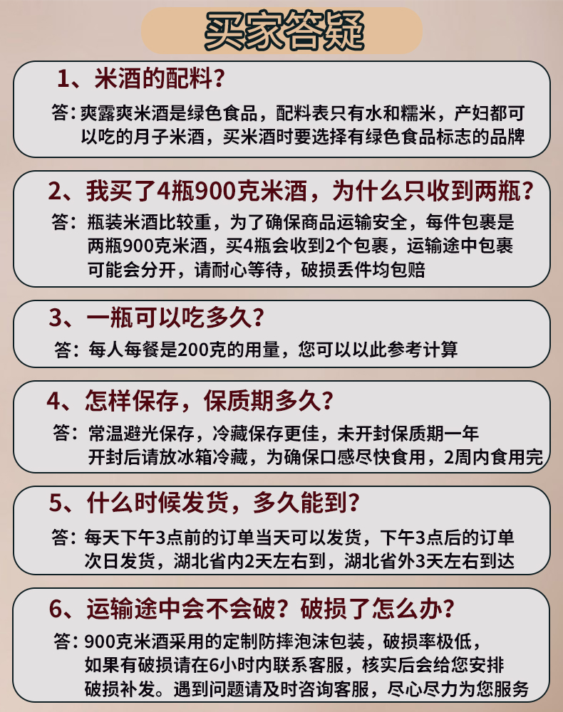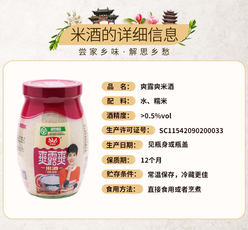 这款爽露爽醪糟糯米酒,拥有绿色食品认证,使用地道孝感糯米为原料发酵而成,一次性瓶装,不经过二次封装,保留了原汁原味,没有其他任何添加,也没有防腐剂。