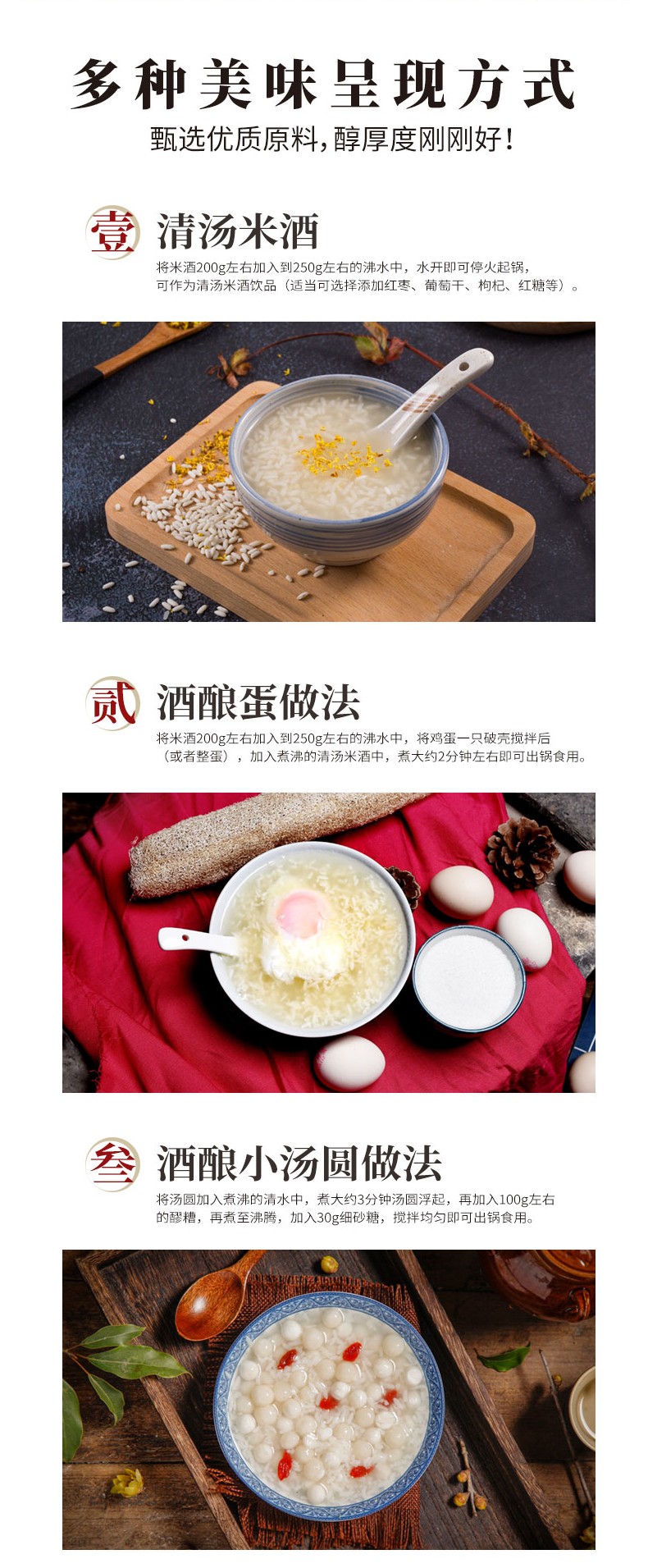 醪糟米酒可以用来直接单喝,也可以做米酒蛋花、酒酿圆子等甜点炖汤煮粥,营养美味。