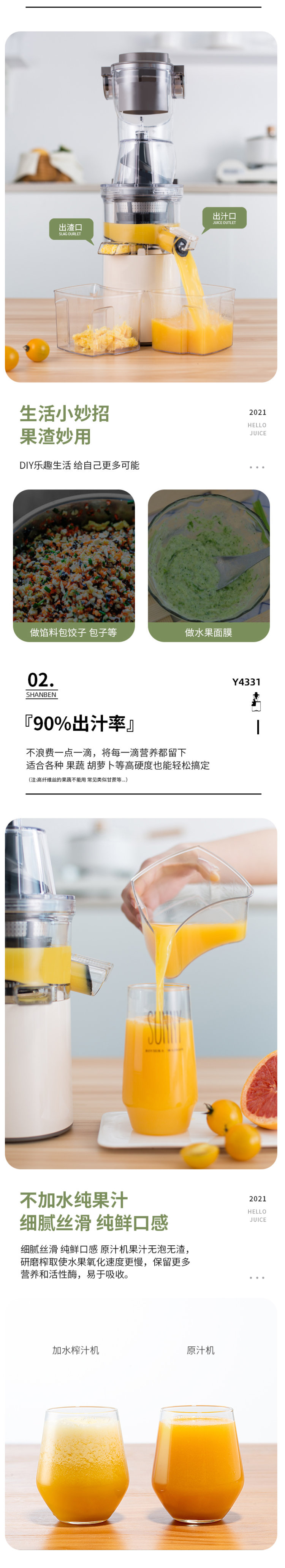 「原汁机」的出汁率高,转速低,电机和挤压过程发热小,不会对果汁进行加热产生氧化,泡沫少,能够保留更多的营养和原味的口感。