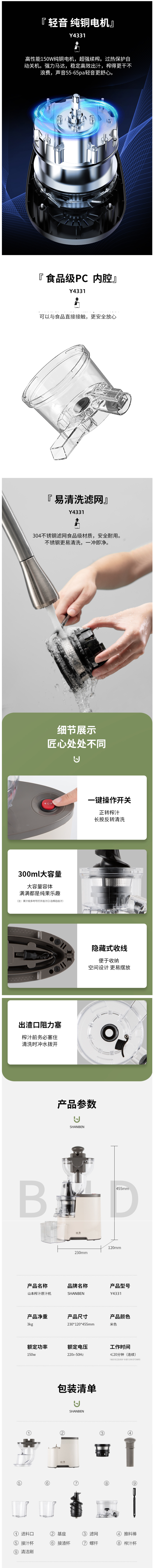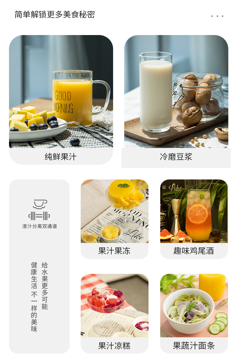 出汁口有闭盖设计,随喝随取,食用方便,U型出渣口,排渣顺畅,不易堵塞。除了榨汁,还可做奶昔、冰淇淋、豆渣饼等,功能非常丰富。清洗时也比较方便,有正反转设计,可随意操控。