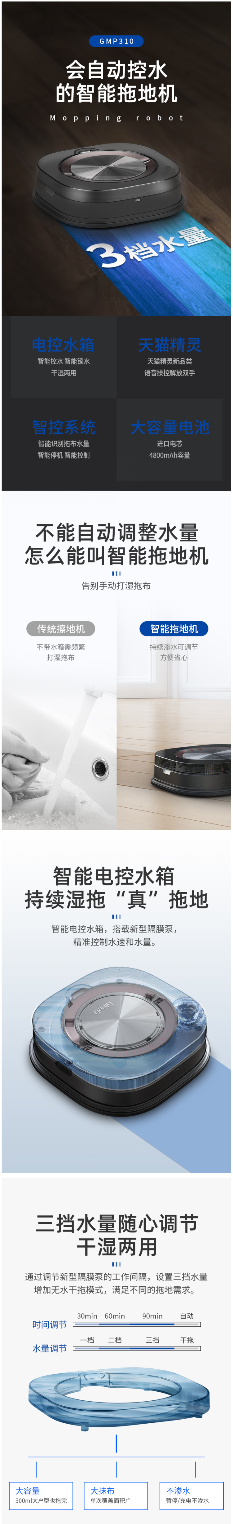 时间和水量都有三档手动调节,增加的自动和无水干拖模式,满足了不同的拖地需求。