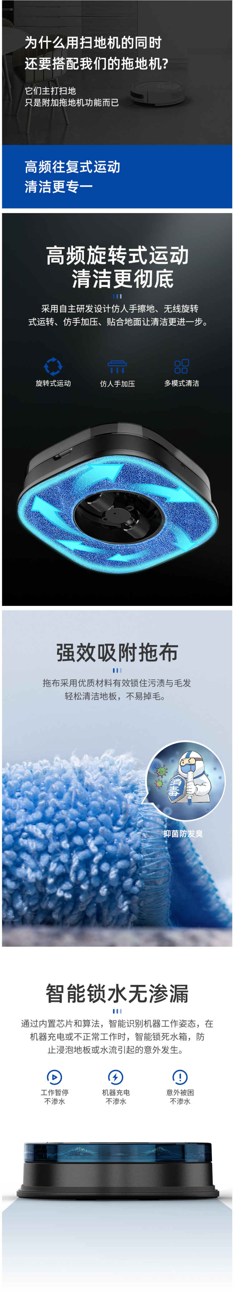 采用自主研发设计的高频旋转式往复运动进行清洁,通过仿人手擦地、无线旋转式运转、仿手加压、贴合地面让清洁效果更彻底。