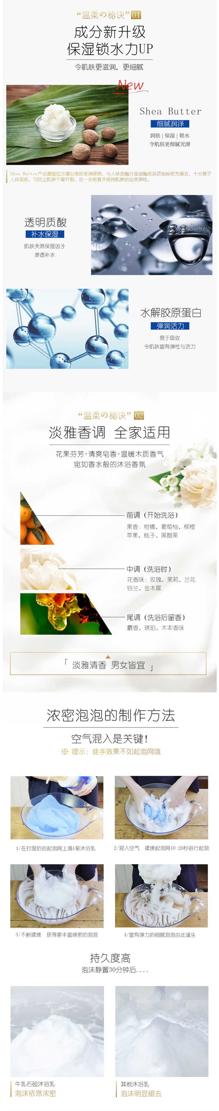 承袭牛乳石碱百年独特釜顶制法,采用植物性石碱素材,成分天然温和,添加了三种美肤成分:胶原蛋白、尿玻酸、牛奶蛋白,深层滋润肌肤,保持沐浴后的肌肤光滑柔嫩。