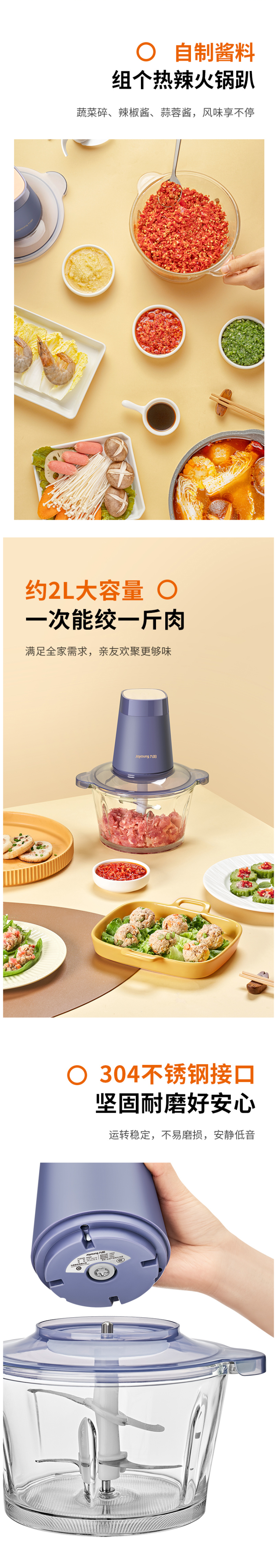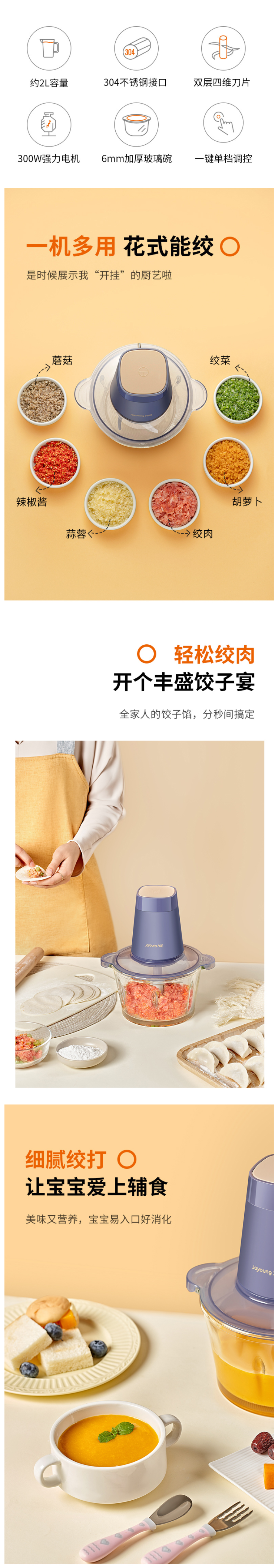 核心机头采用300w纯铜电机,动力强劲,寿命持久,搭配双层四维刀头,多角度轻松搅碎食物,有高速和低速两种模式,高速用来绞硬食材,比如核桃、肉类、花生、胡萝卜;低速用来绞软食材,比如水果、洋葱、鸡蛋、馅料、葱姜蒜。