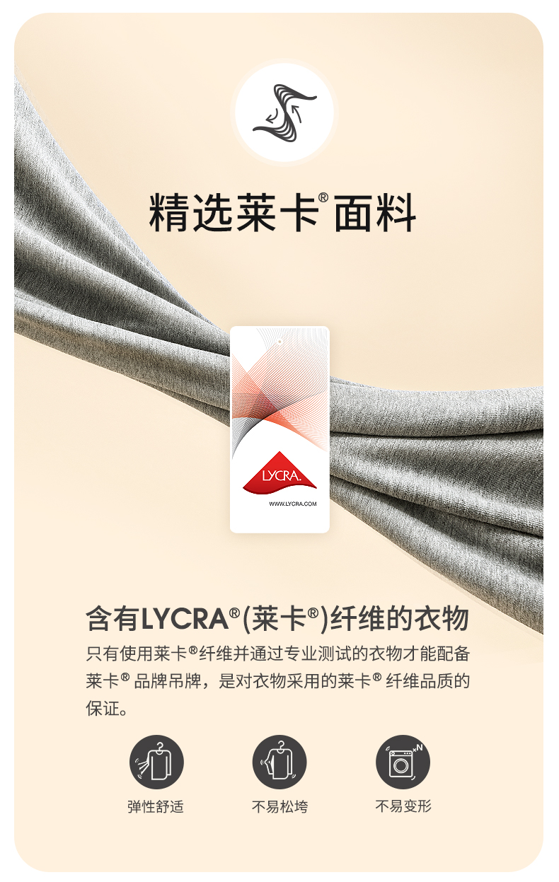 莱卡是英威达(英文INVIST)旗下氨纶弹力纤维的品牌,在面料中加入少量氨纶,可增大面料的弹性,不影响面料的原有特性,像纯棉面料混入5%的氨纶,就可拥有3.5的牵伸倍数。服装面料混入氨纶,可以做的修身贴合,同尺码适合不同身材。同时衣服有回弹不容易变形,不容易松懈。