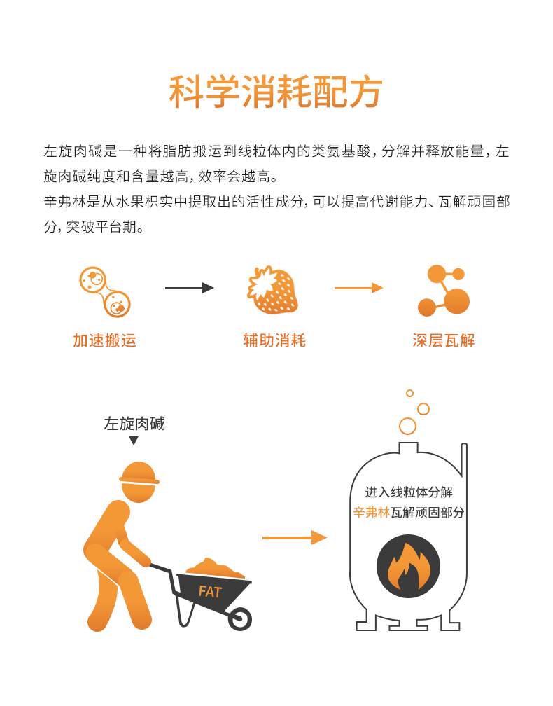 脂肪如果不进入线粒体进行氧化分解,再高强度的运动节食都白费,左旋是一种将脂肪搬运到线粒体内的类氨基酸,能分解并释放能量,当左旋肉碱纯度和含量越高,效率会越高。