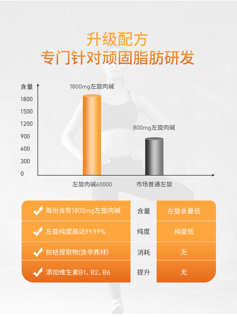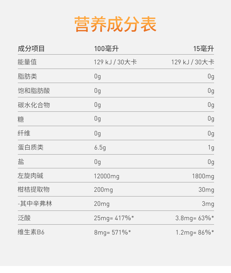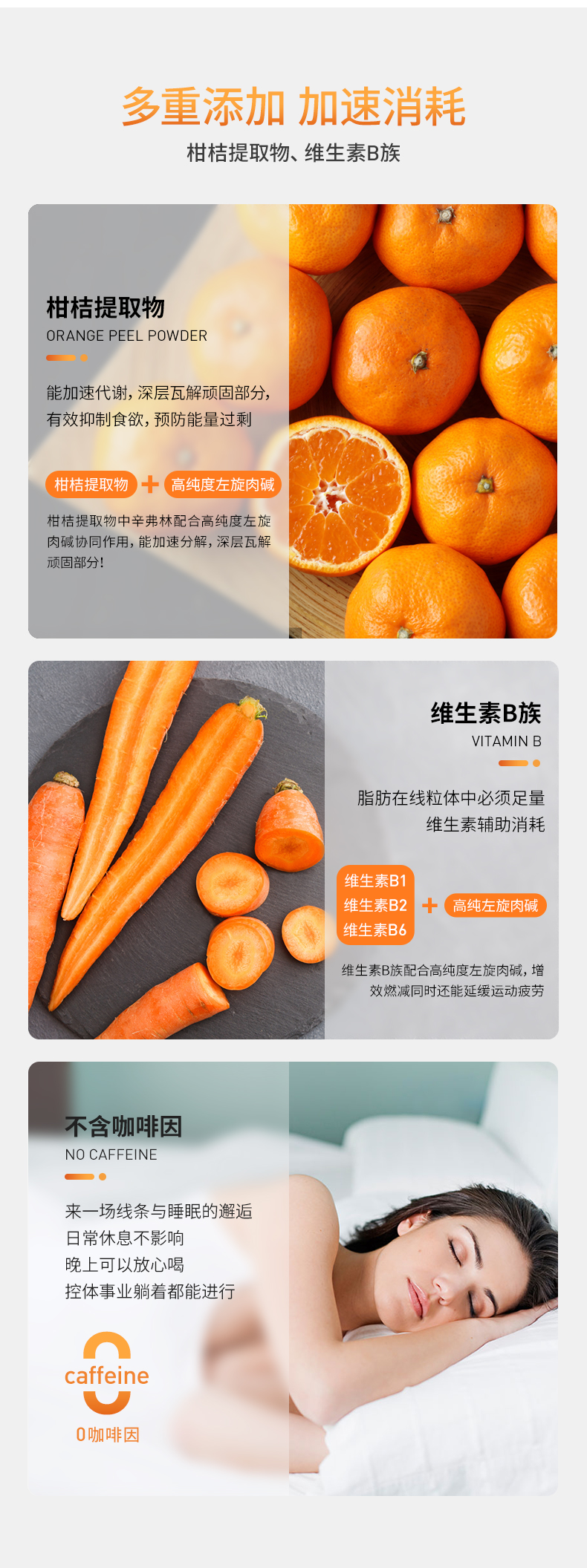 每10ml含有1200mg左旋肉碱,纯度高达99.99%,同时人体的吸收率也达99%,0糖分,0热量,0咖啡因。维生素B族协助脂肪在线粒体中分解燃烧;柑桔提取物能加速代谢,深层瓦解顽固部分,有效抑制食欲,预防能量过剩。