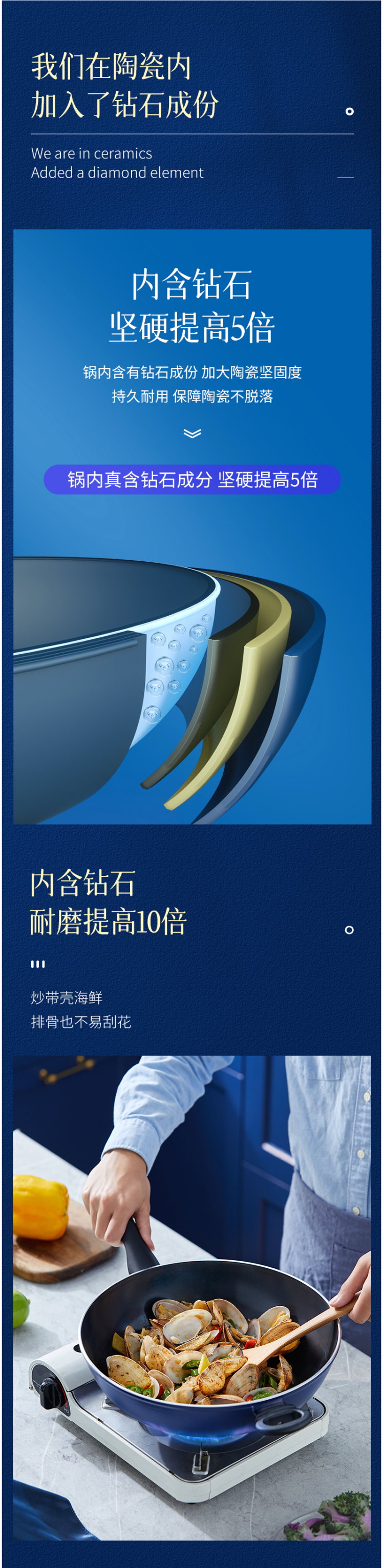 这款蓝钻Bluediamond 不粘陶瓷炒锅,使用第六口进口陶瓷专利技术,在陶瓷中加入了钻石成分,使得整体坚硬度提高了5倍,持久耐用。
