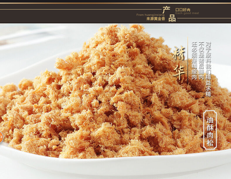 这款猪肉黄金肉松传承百年的工艺精髓,选用猪后腿瘦肉,不沾生水,除去筋膜,修剪整齐,经过煮制、撇油、调味、收汤、炒松、搓松等工序制作而成,具有自己的饲养基地,一头猪从屠宰到下锅,4小时之内完成,猪肉的含量高,鸡肉、大豆粉等含量低,是正经靠谱的肉松。喝粥、寿司、炒饭,儿童零食都可以!