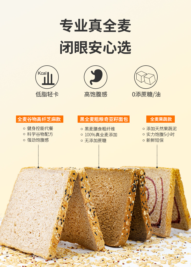 有100%真全麦、黑麦奇亚籽、高纤谷物坚果、抹茶蔓越莓、紫薯馅、南瓜馅、香蕉馅、果蔬混合多种口味可选。专业的营养师制作,科学的食材配比,不添加油和蔗糖,低脂轻卡,富含纤维素和蛋白质。营养均衡,饱腹代餐,老少皆宜。