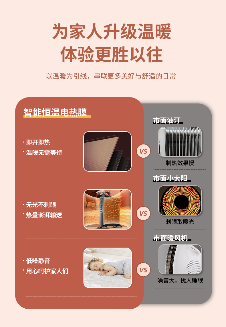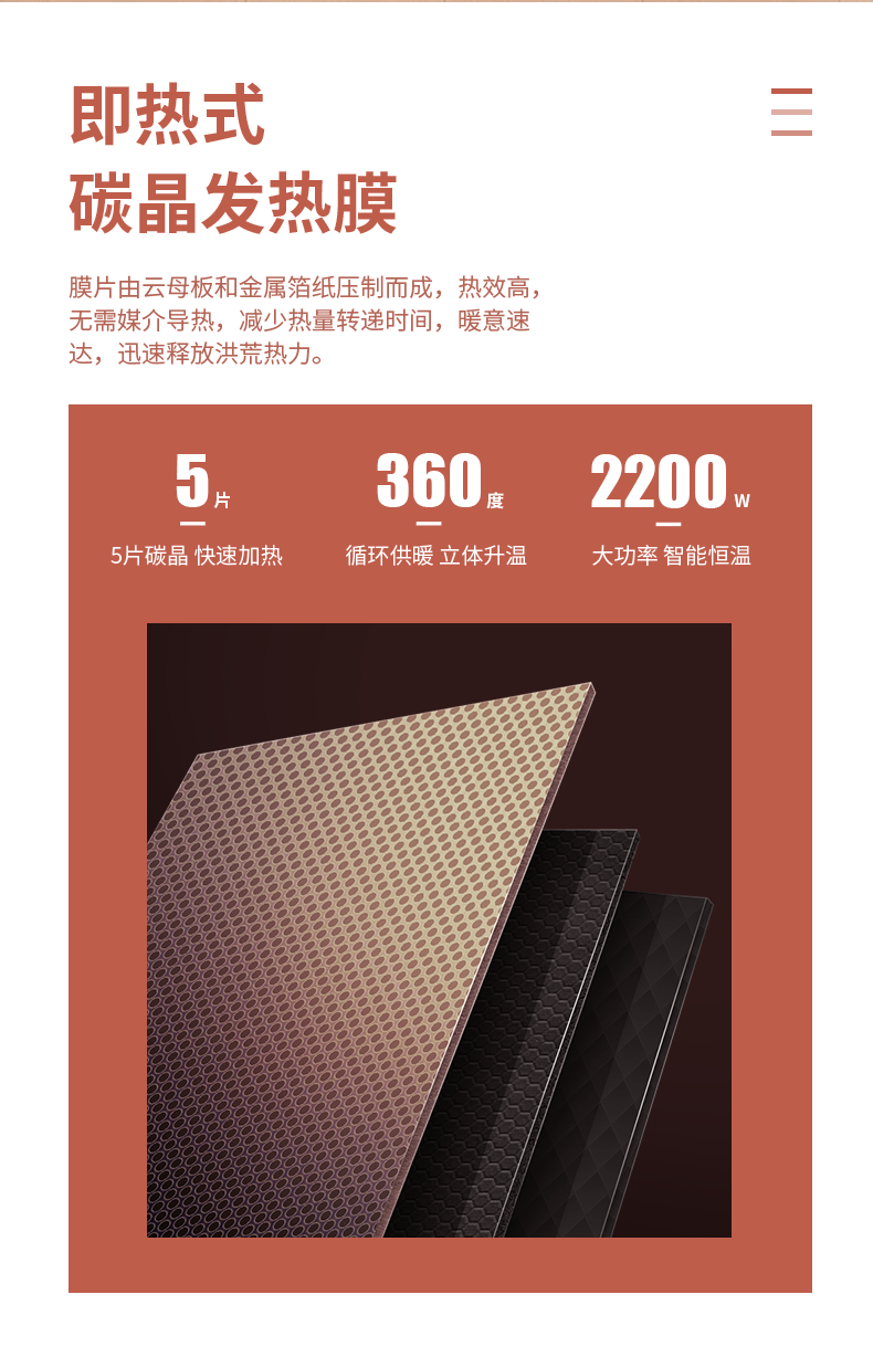 硅晶电热膜取暖气,相对于小太阳等风扇取暖器,采用面式供暖,升温快、无电磁污染、发热均匀。和电油汀相比,在制热速度、转换效率、重量方面都有优势,因此是较为先进的取暖设备。