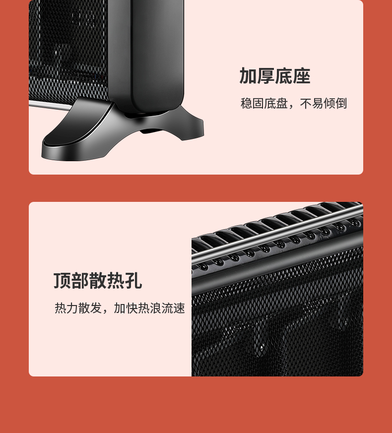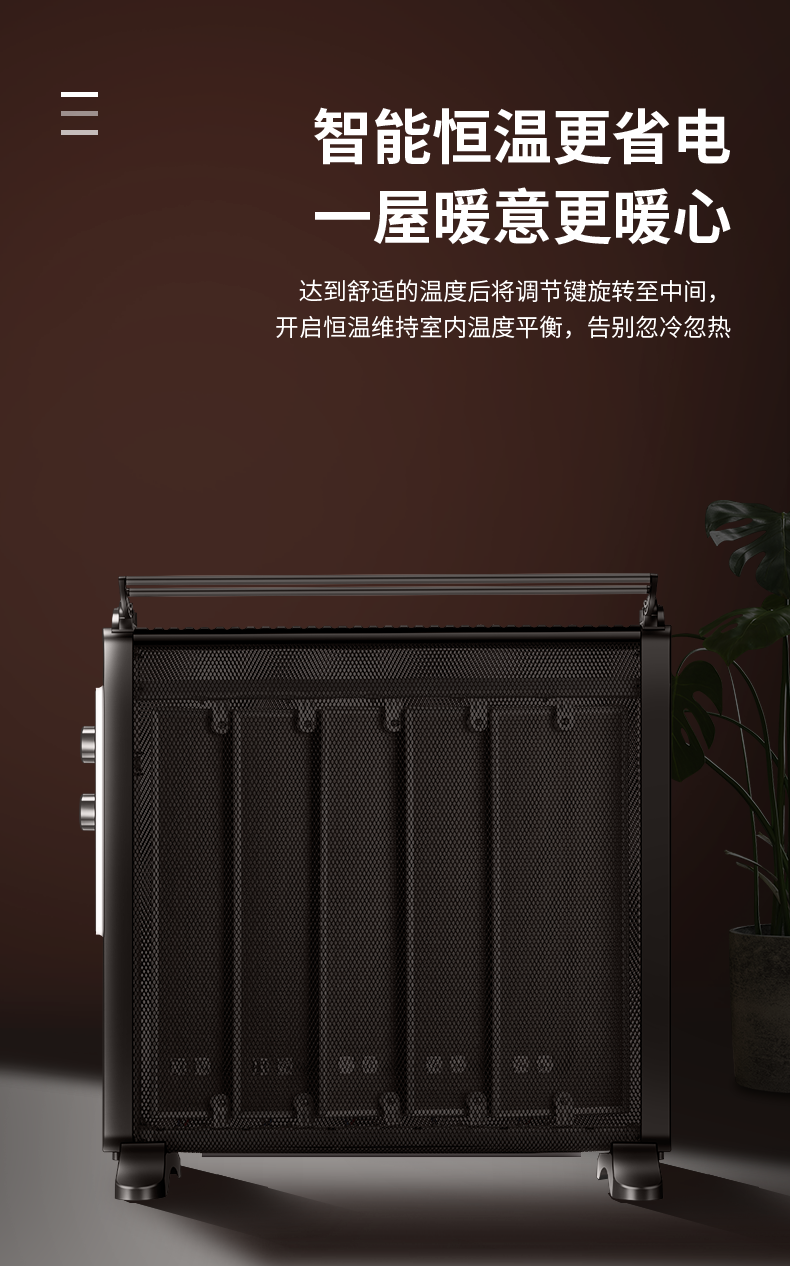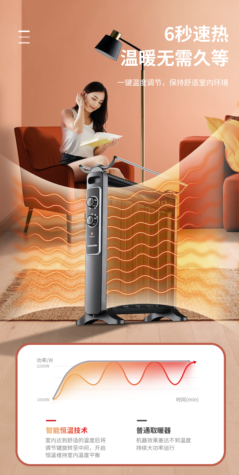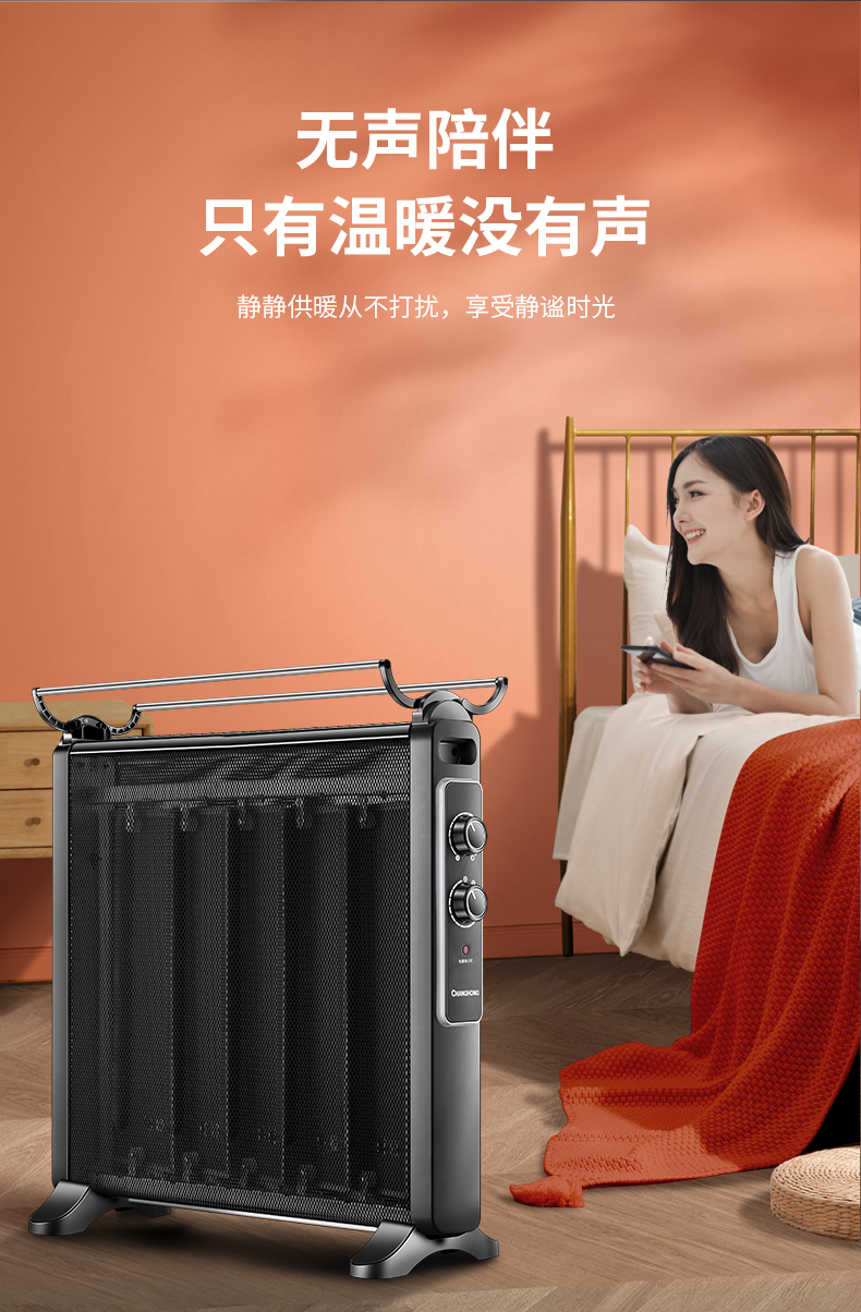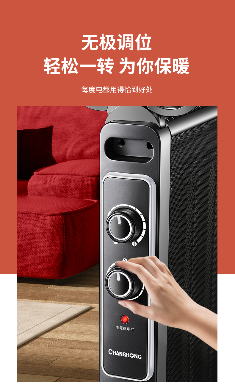 这款长虹电热膜取暖器使用优质硅晶电热膜,升温快,而且无光无味无噪音,与油汀相比,使用轻巧灵便,热效率高,内部有多条电热膜芯片,能够有效承载电流,迅速发热,开启后3秒速热。采用智能微电脑实现电子式控制,具有两档功率选择,最高能达到2000W功率,温度高,散热快。