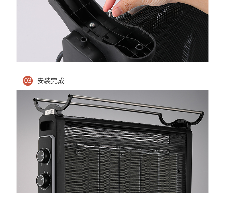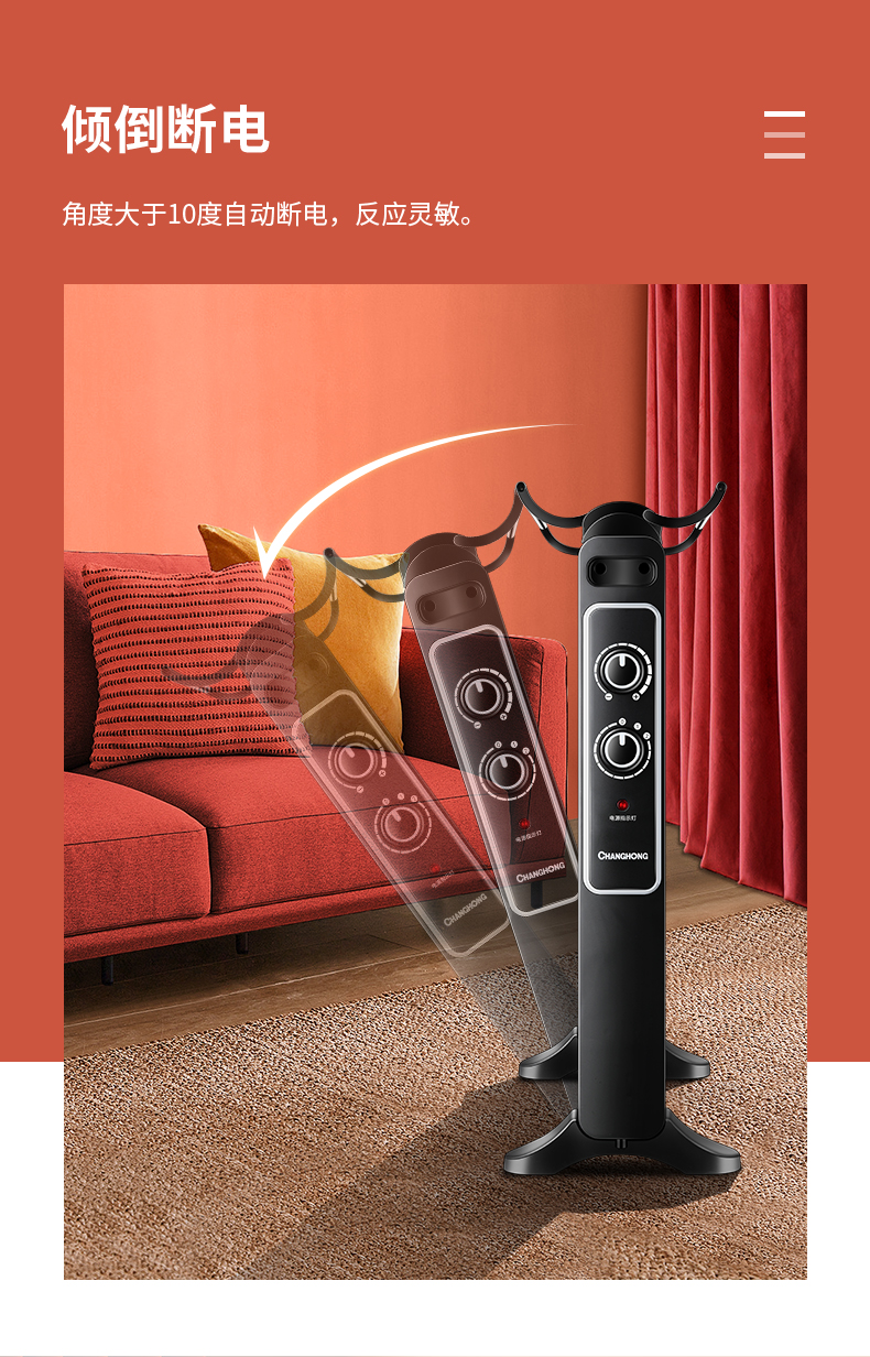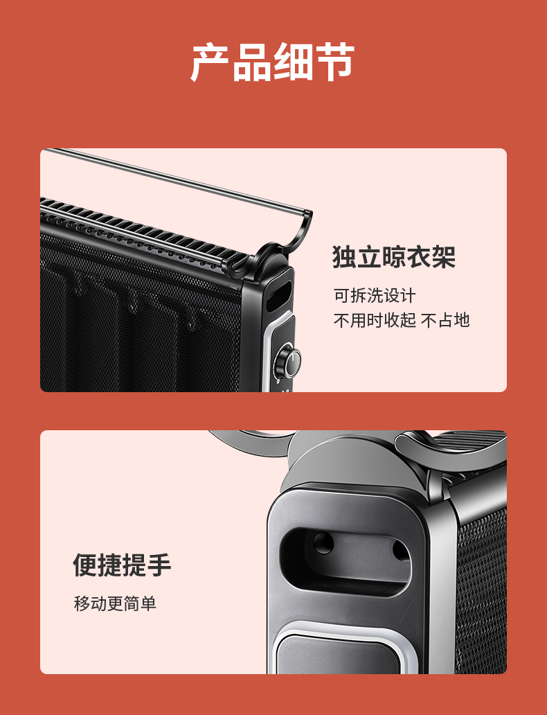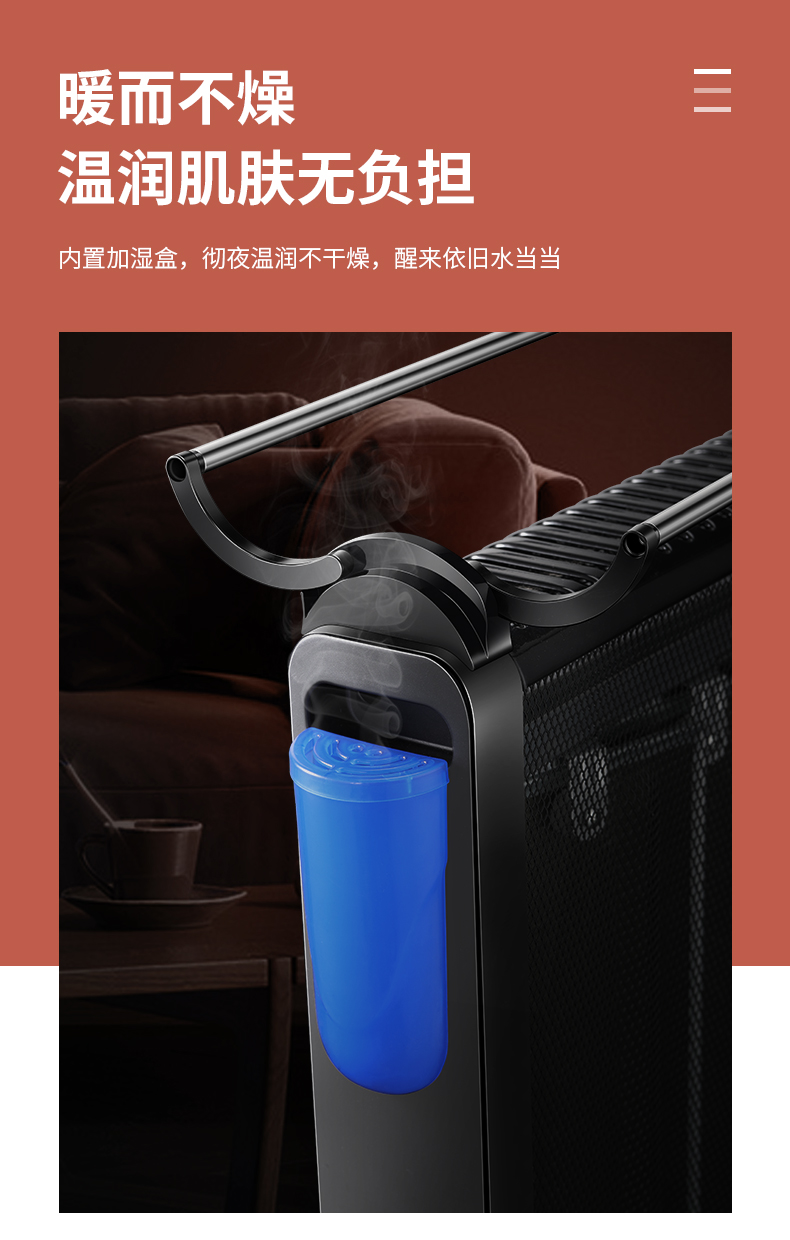 在细节和安全方面,15°机身倾倒断电保护、过热断电保护和表面防烫网,还自带便携式干衣架,可自由折叠,能迅速烘干衣服;隐藏式加湿盒,制热取暖时空气不干燥,人体舒适度较高。