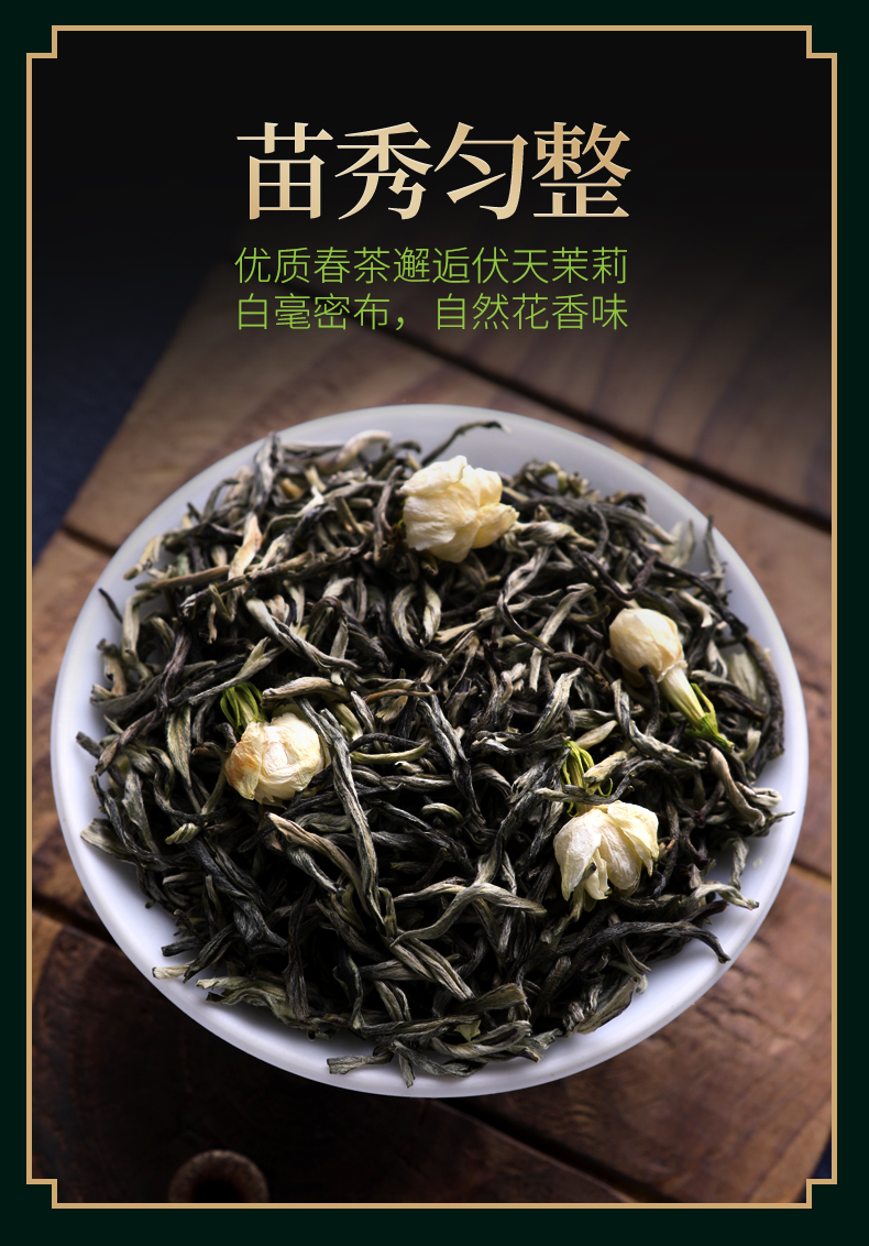 这款郡望堂号正宗茉莉花茶,特级浓香型,选用横县原产浓香茉莉和高山绿茶,茶形花形匀整优美、白毫密布。冲泡后,鲜浓的茉莉花香飘逸,花香茶香相互渗透,沁人沁脾,这是花与茶的完美邂逅,口感醇正顺滑。