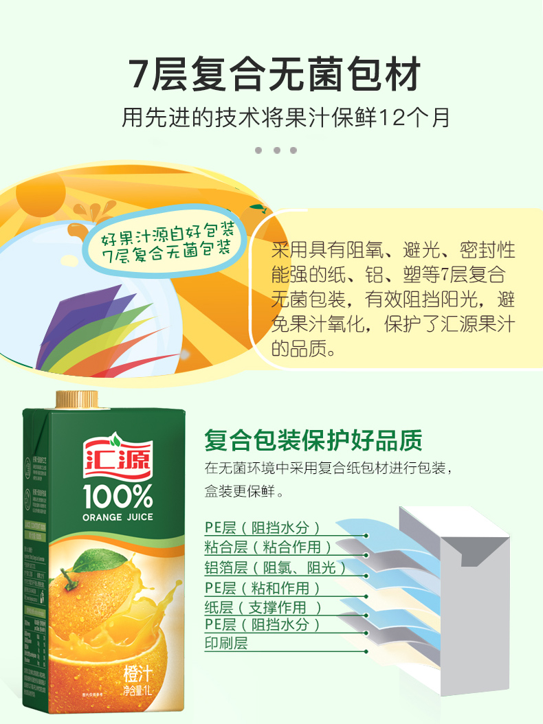 采用无菌冷罐装技术,经过UHT瞬时杀菌,以25℃的冷罐装,更好的保留了果汁的营养、色泽和美味。外包装采用具有阻氧、避光、密封性能强的纸、铝、塑等7层复合无菌包装,有效阻挡阳光,避免果汁氧化。
