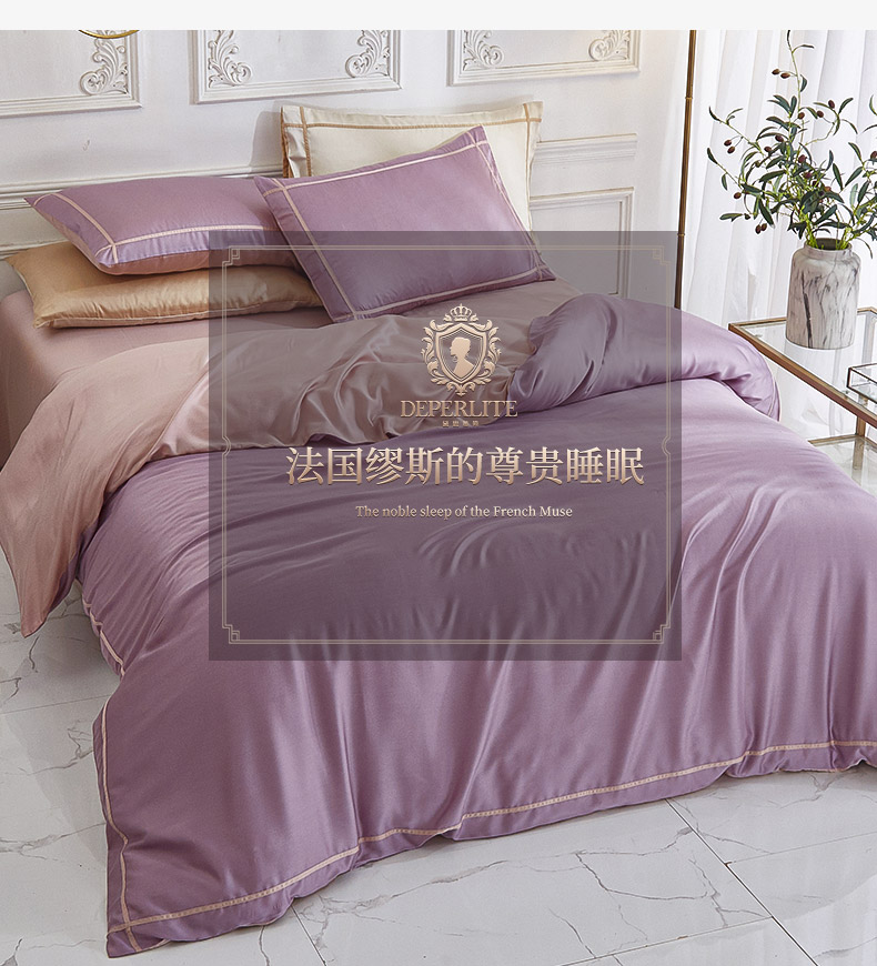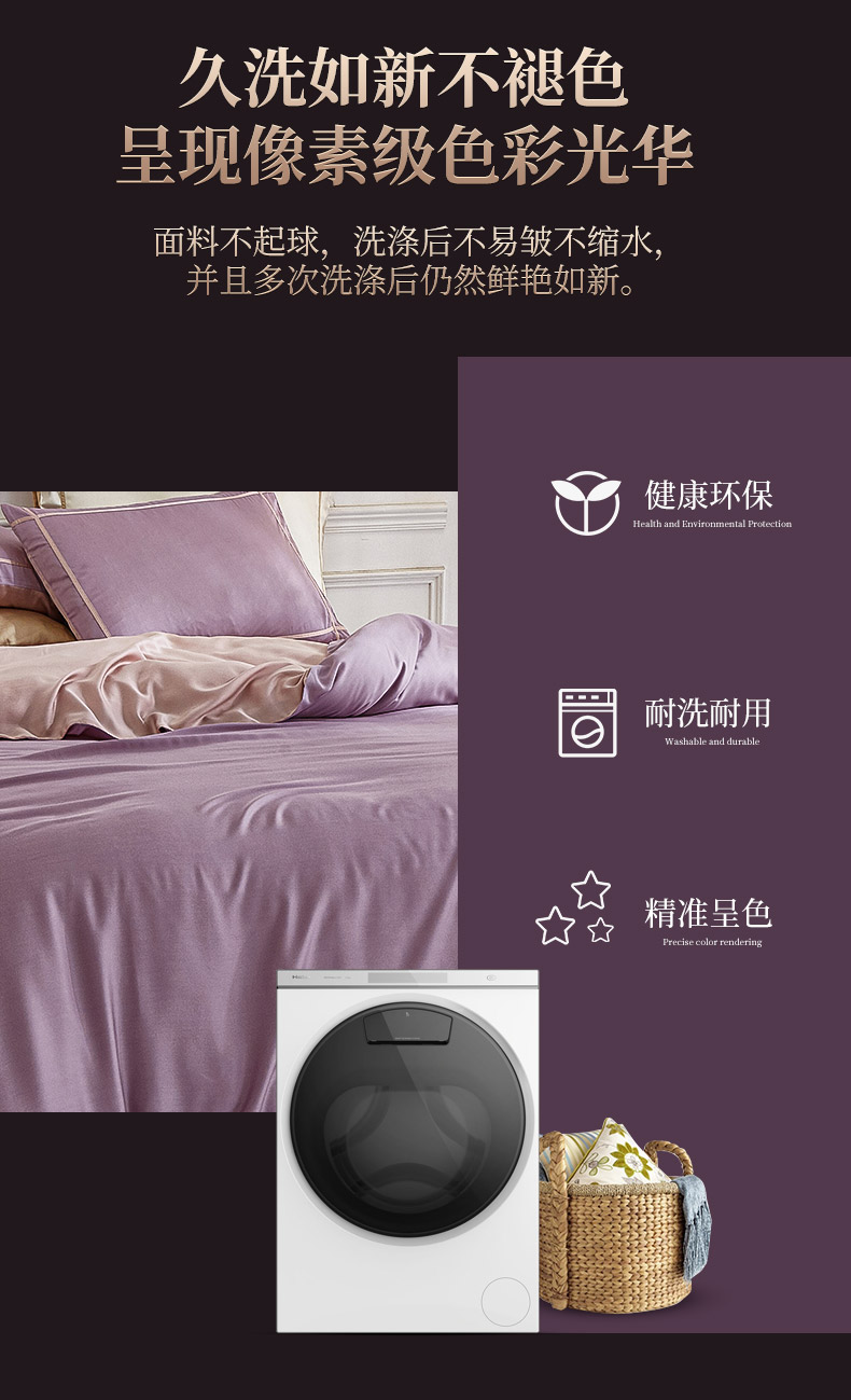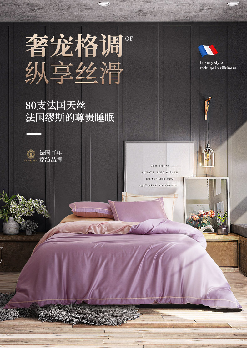 材质甄选比纯棉更高品质的法国天丝棉,双股100S面料具有强柔滑感,触感颇为舒适,具有普通面料不具备的良好光泽度,比棉更高的优异透气吸湿特性,自带排汗属性,仲夏清凉不燥。采用更复杂的缎纹工艺织造,相较于平纹与斜纹纺织,面料光滑有质感,质地更加轻柔贴肤。给您优质的睡眠体验,贴近自然的舒适感。