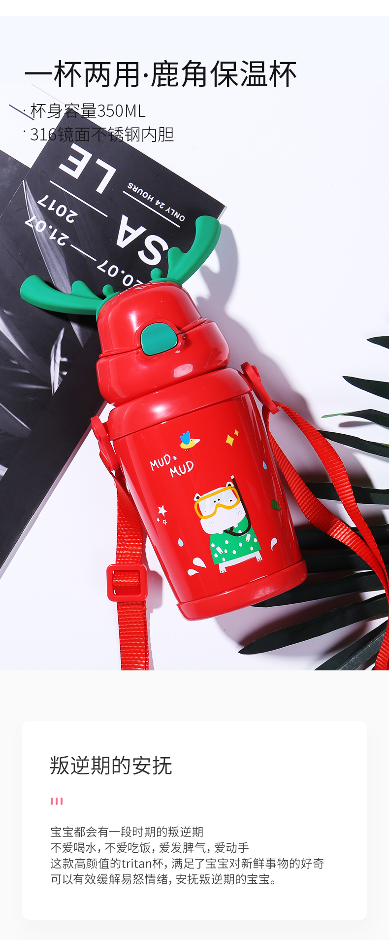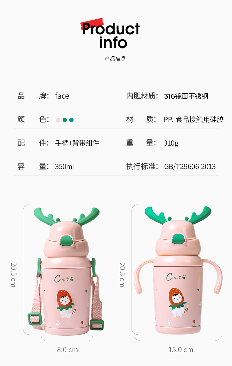 专利鹿角设计,硅胶材质,柔软安全,吸管是食品级硅胶材质,不含双酚A,对人体健康无害,内胆为高端316不锈钢材质,保证儿童用水安全。规格:450ml。
