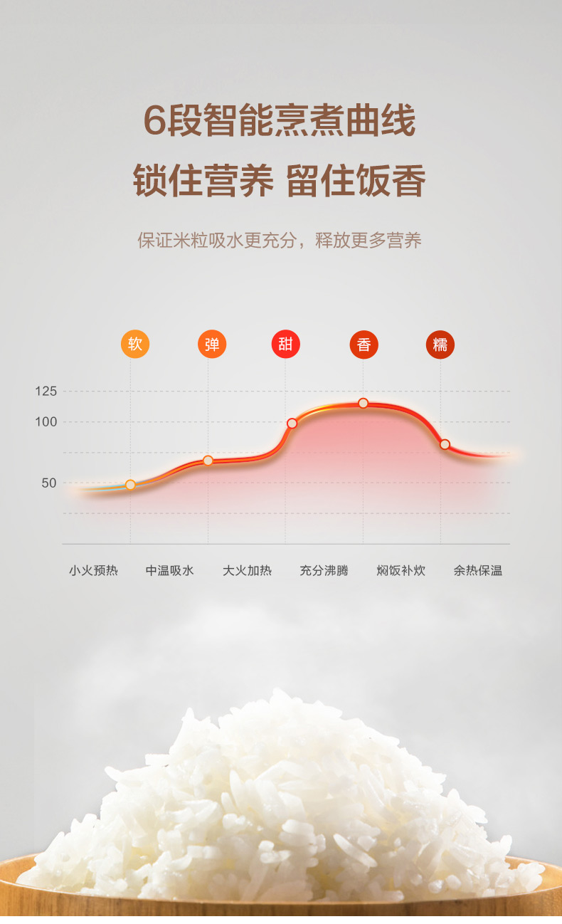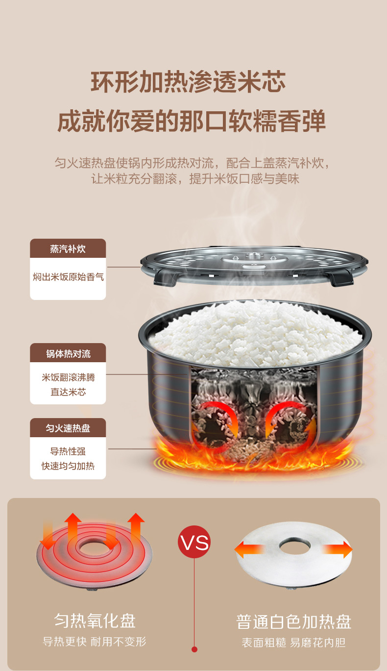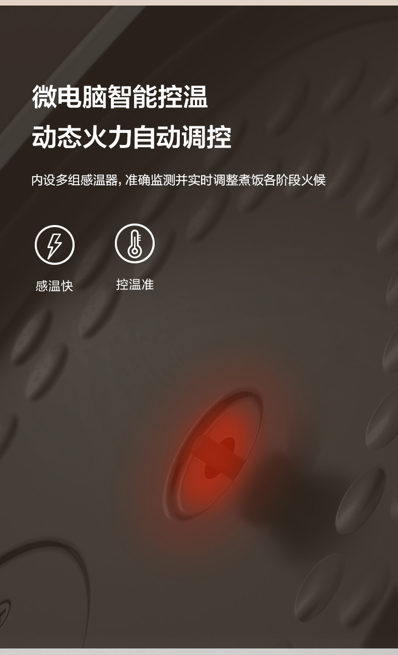 匀火速热盘使锅内形成热对流,配合上盖蒸汽补炊,让米粒充分翻滚,提升米饭口感与美味。内设多组感温器,准确监测并实时调整煮饭各阶段火候。