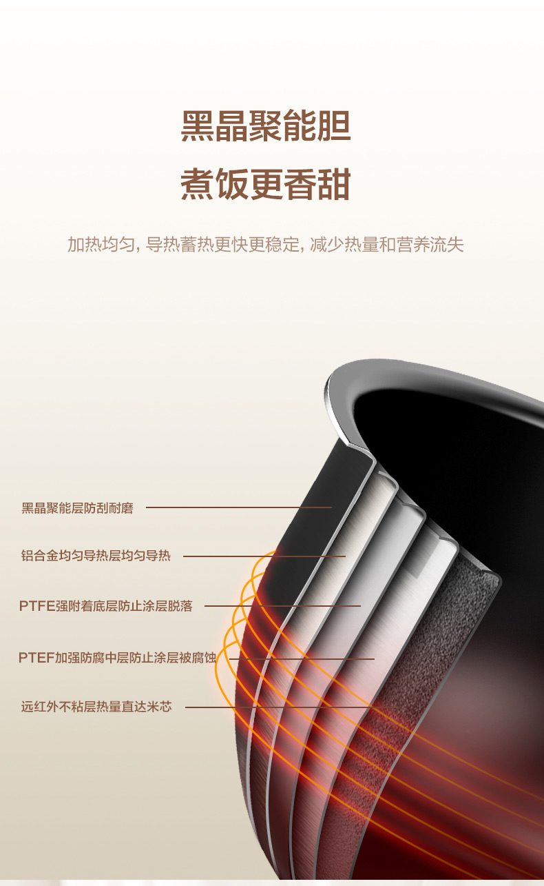 升级黑晶聚能内胆,由五层复合材质制成,分别是远红外不粘层→热量直达米芯、PTFE加强防腐中层→防止涂层被腐蚀、PTFE加附着底层→防止涂层脱落、铝合金均匀导热层→均匀导热、黑晶聚能层→防刮耐磨,导热迅速,蒸饭不粘,清洗省事。