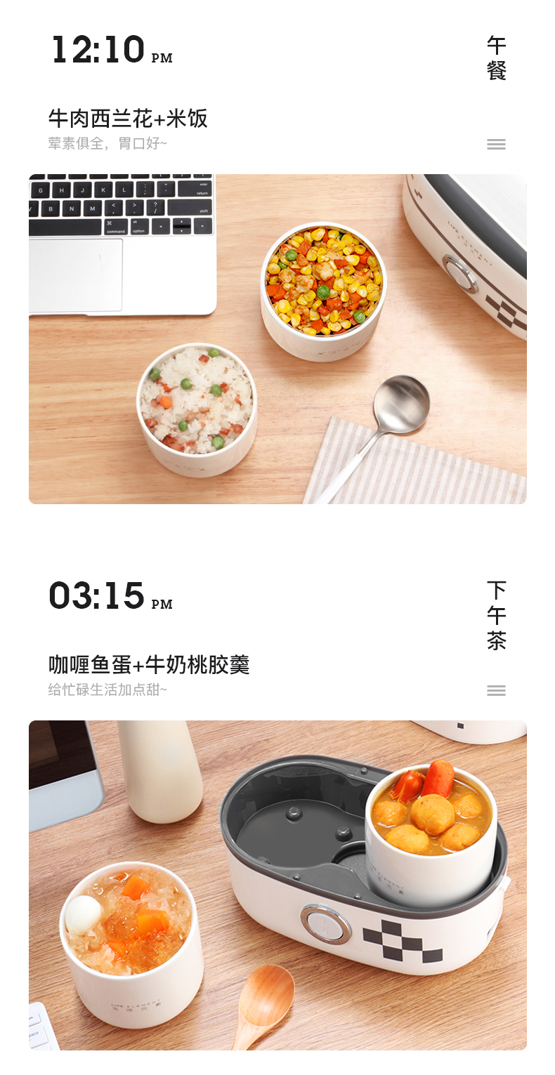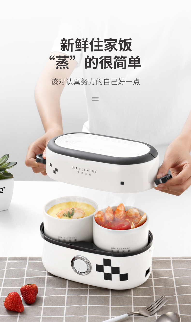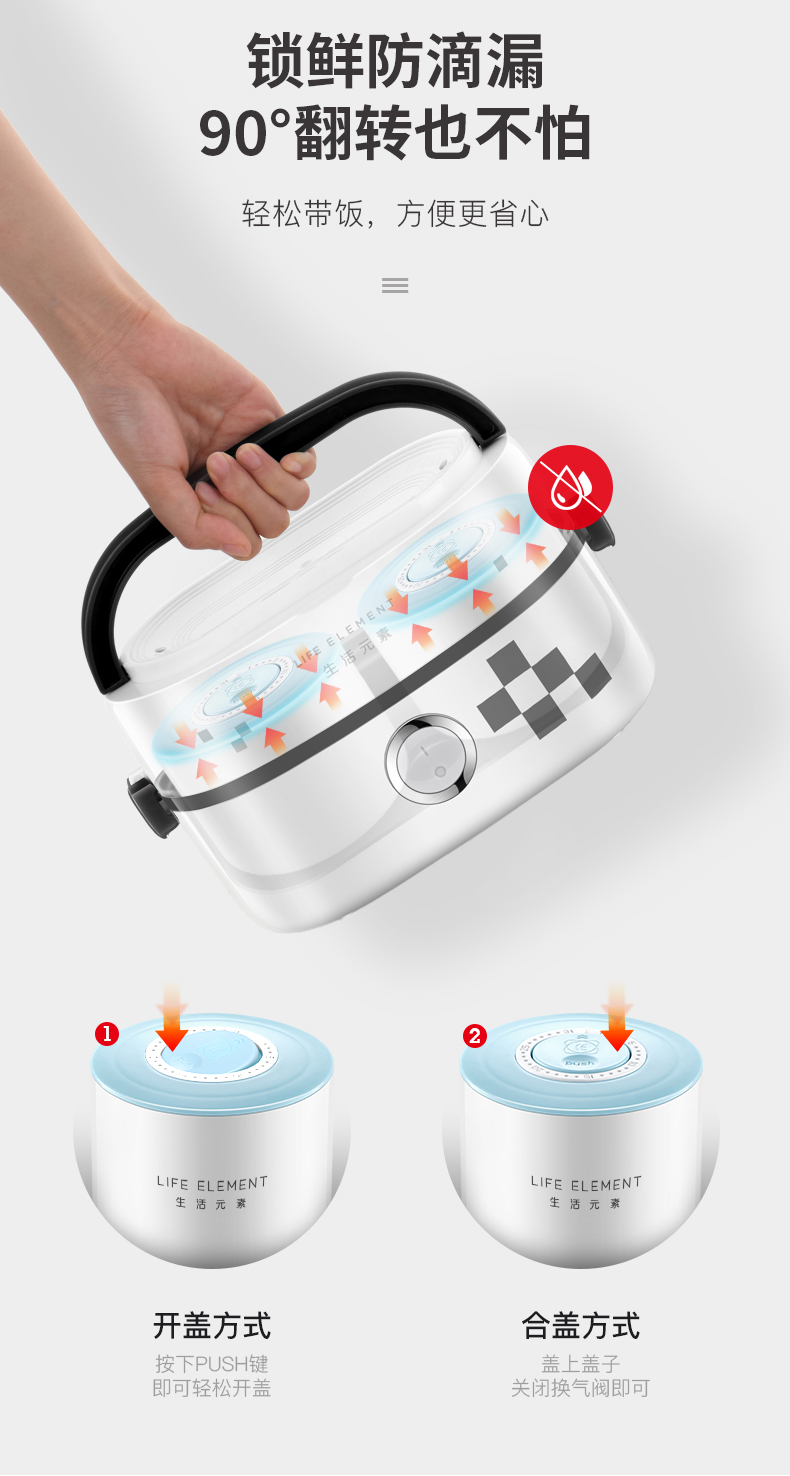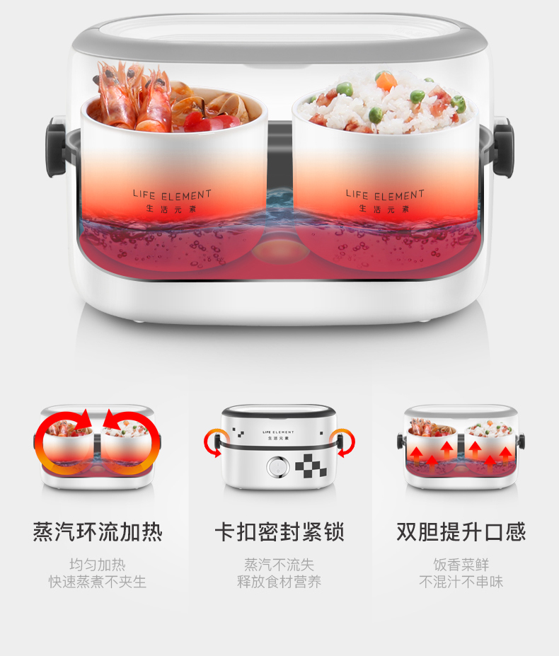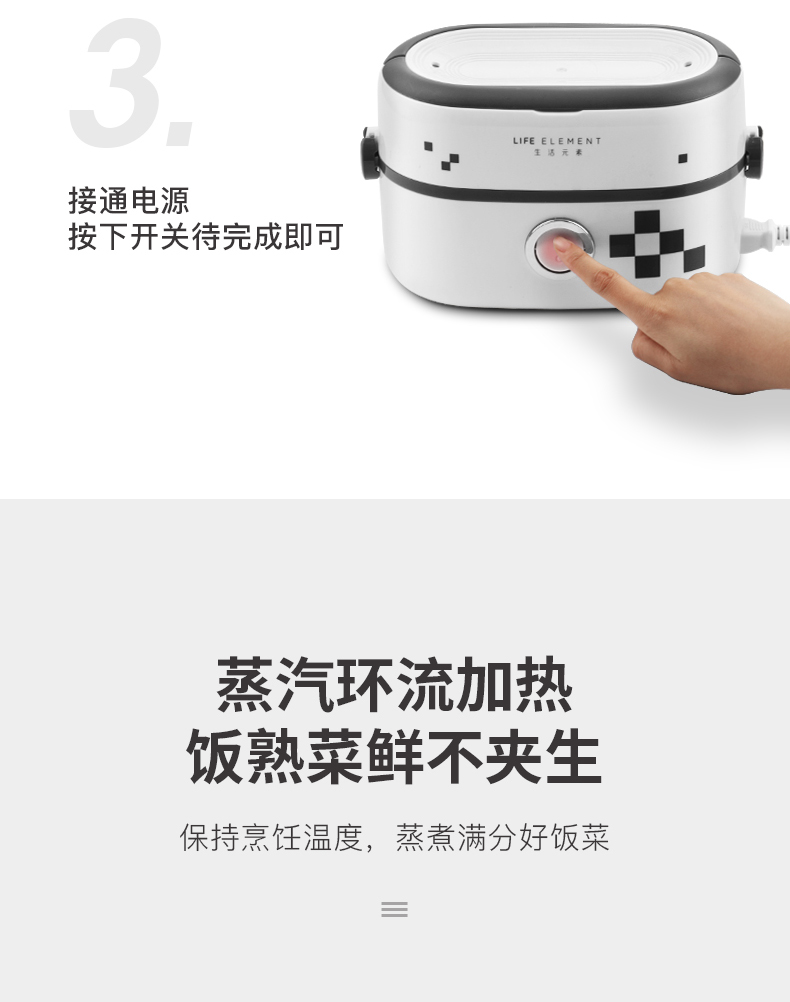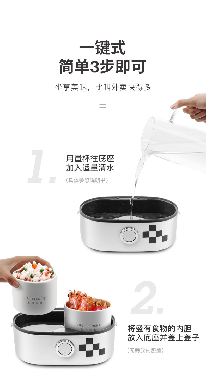 这款电热饭盒,简单三步就可轻松蒸煮:将食材和调料放进盒子里;底部放上水;盖上盖儿一键烹制,简易快捷。电源线跟饭盒是分离的,加上提手设计,方便易携带。同时还有防干烧功能,缺水即可停止工作,安全有保障。而且外表告别了传统的饭盒,是时尚手提包设计,简约优雅。
