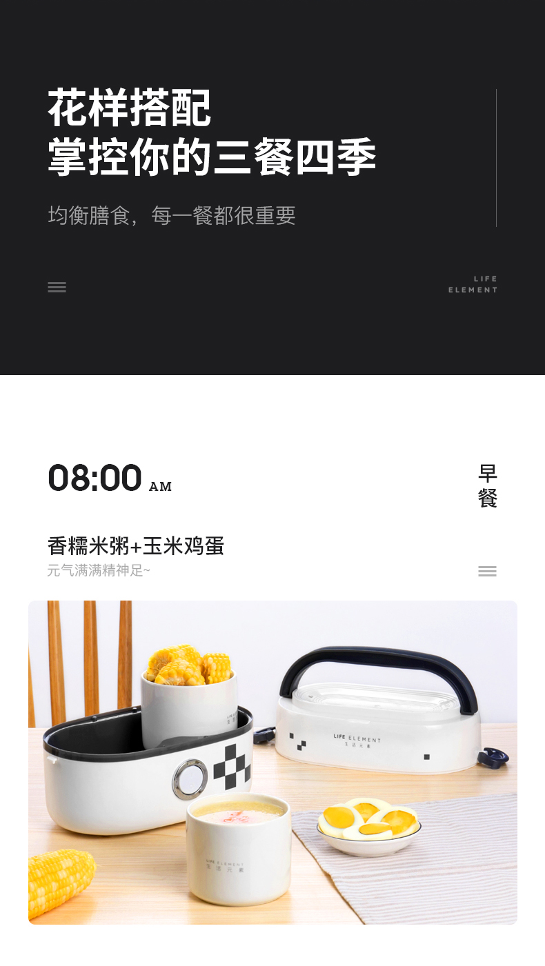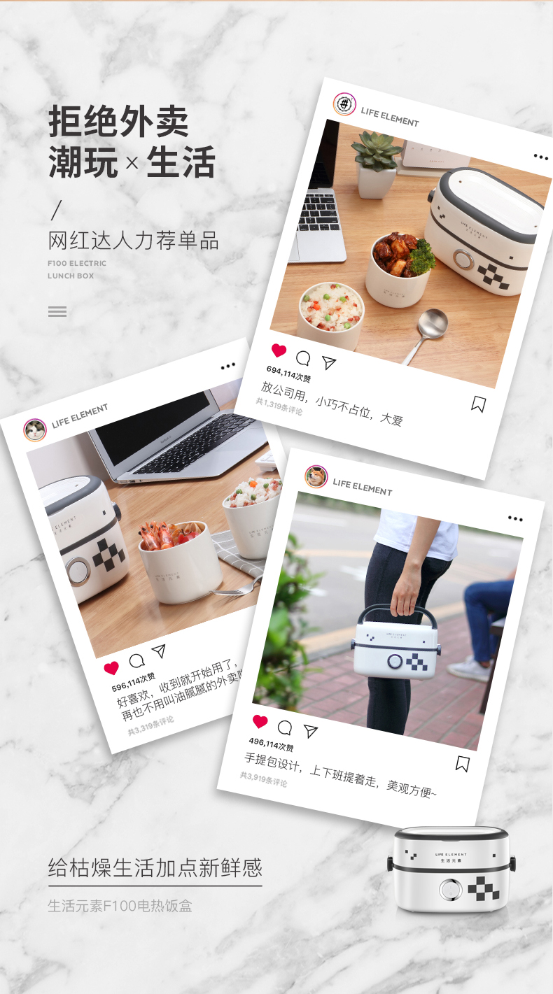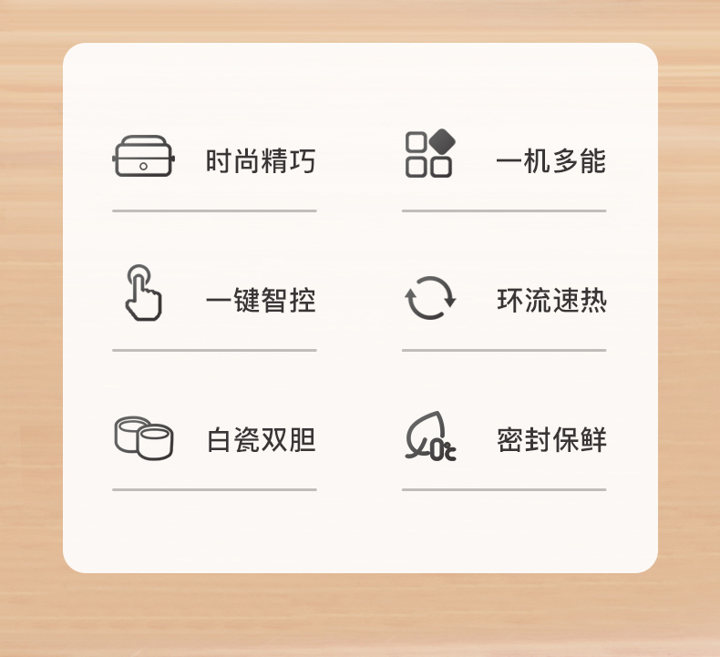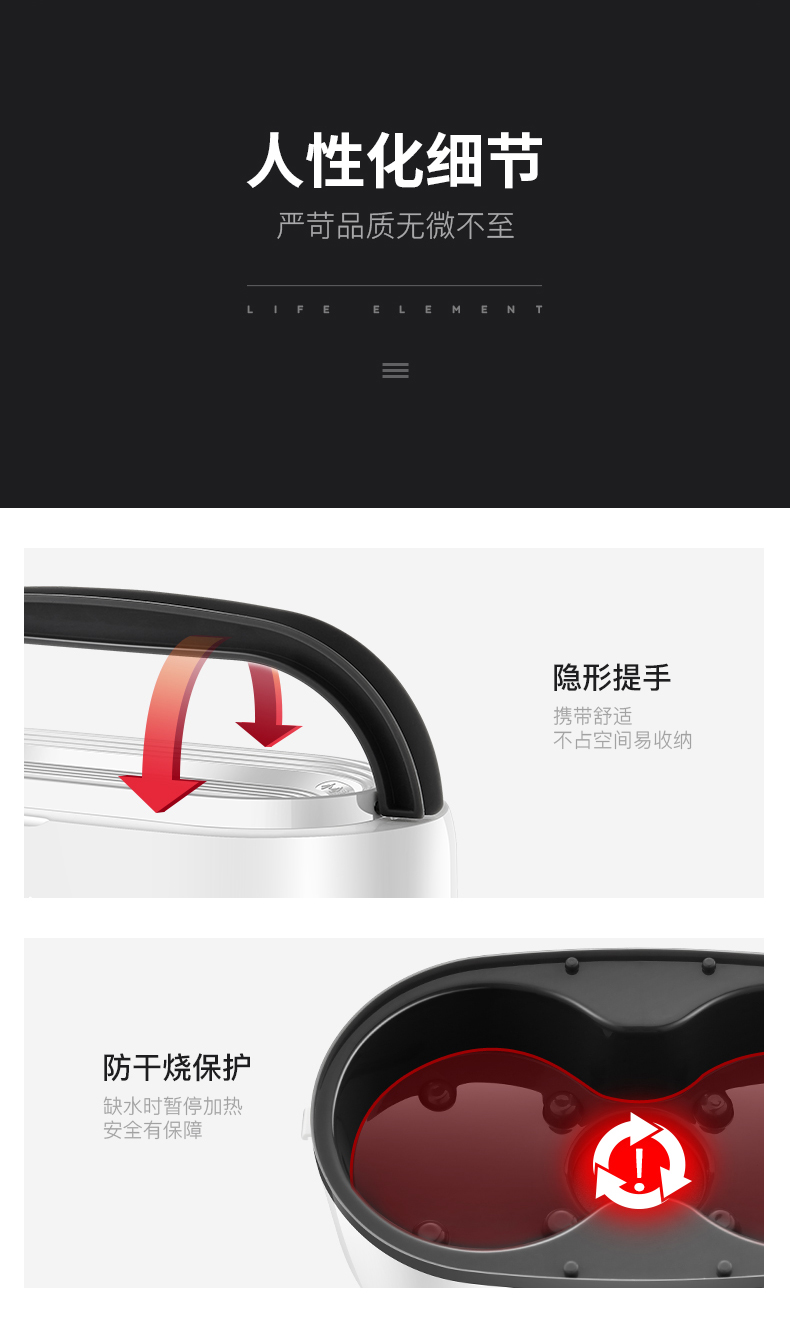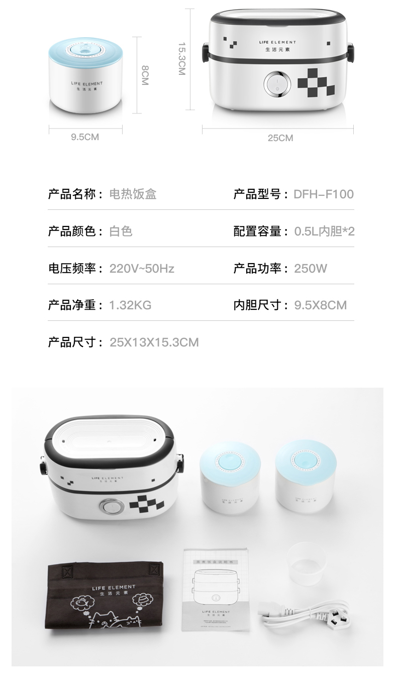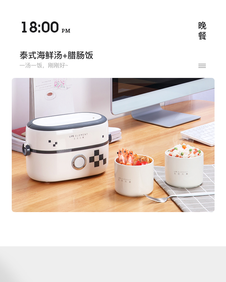 这款电热饭盒,简单三步就可轻松蒸煮:将食材和调料放进盒子里;底部放上水;盖上盖儿一键烹制,简易快捷。电源线跟饭盒是分离的,加上提手设计,方便易携带。同时还有防干烧功能,缺水即可停止工作,安全有保障。而且外表告别了传统的饭盒,是时尚手提包设计,简约优雅。