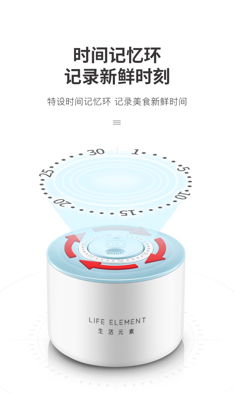 开盖按push按键,打开换气阀,即可轻松开盖。容器盖上密封盖,关闭换气阀,紧密不渗漏。密封盖上还有独特的时间记忆环设计,可随时记录美食新鲜食材。盖的两边是紧密双扣设计,不会脱落。
