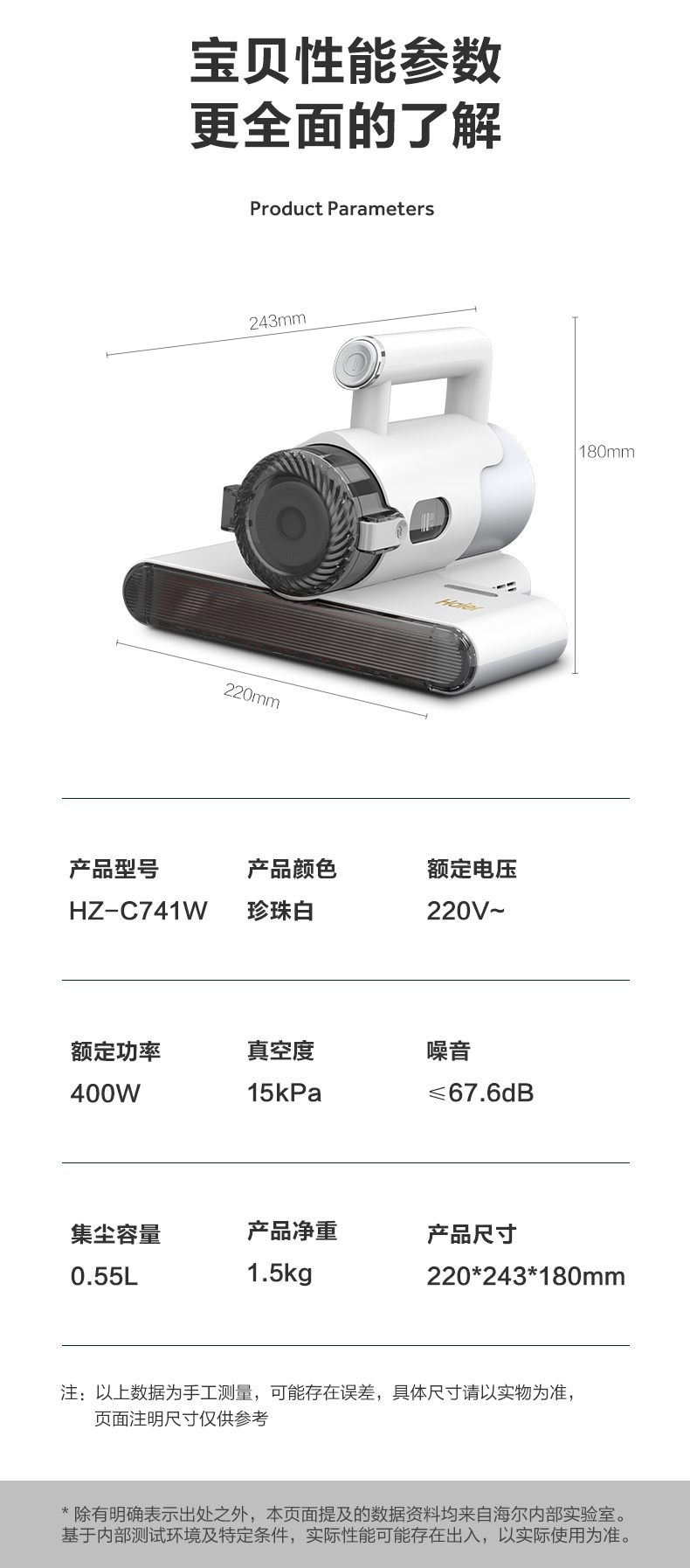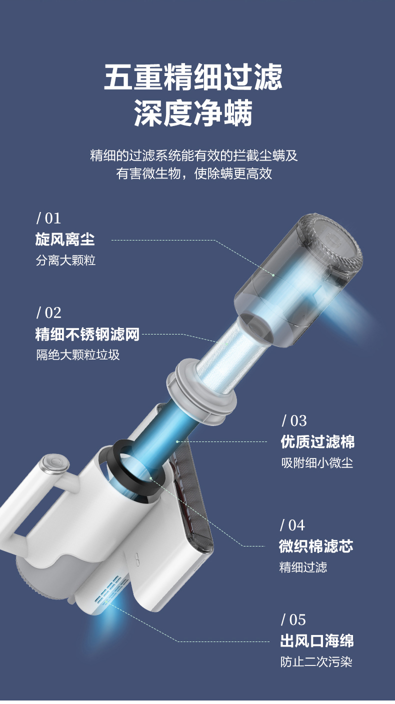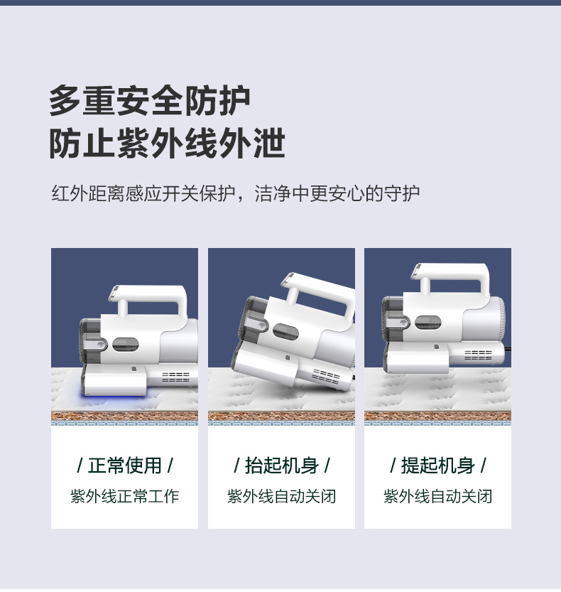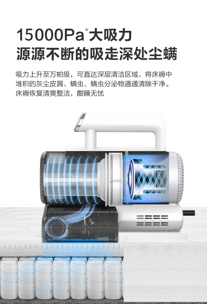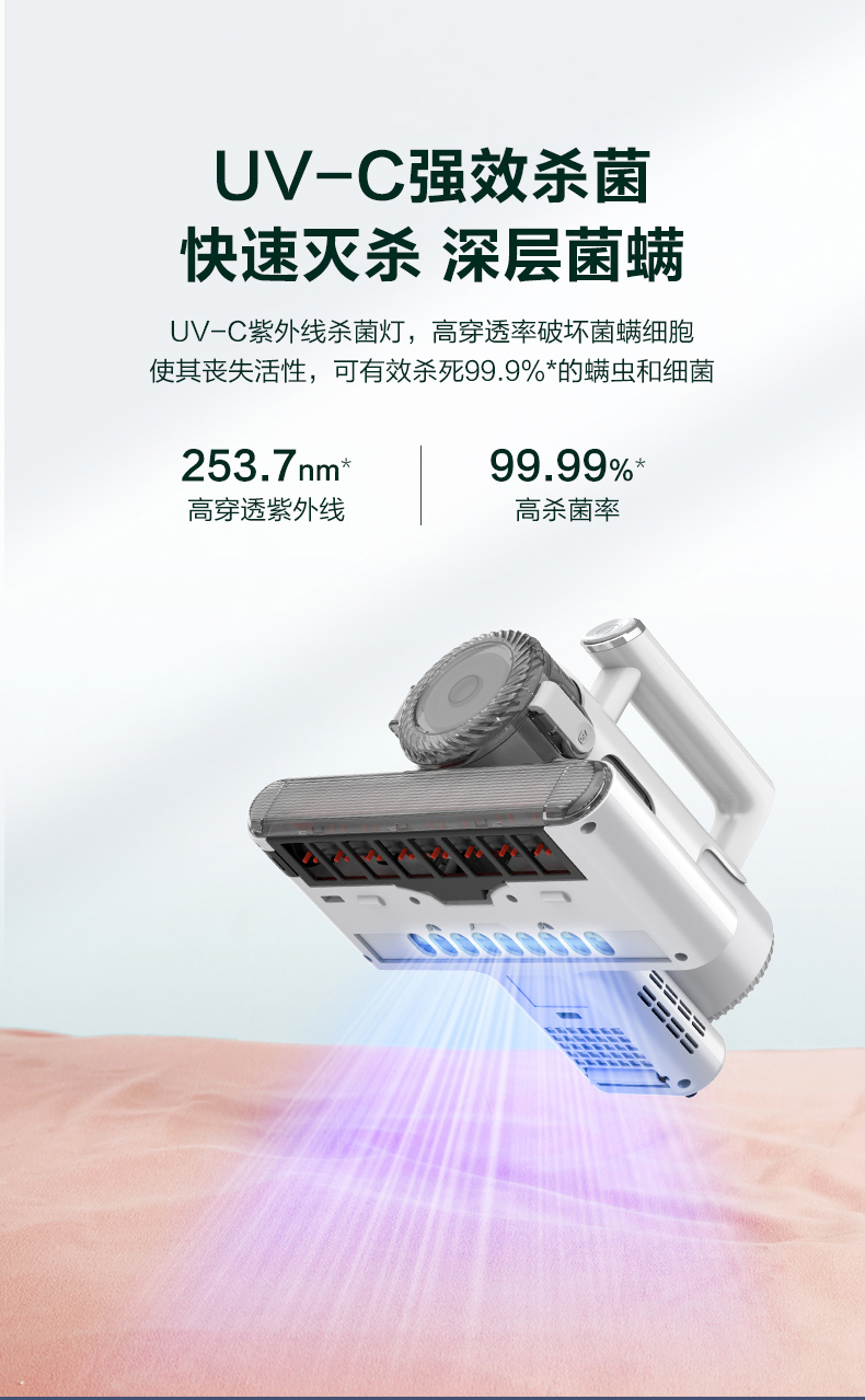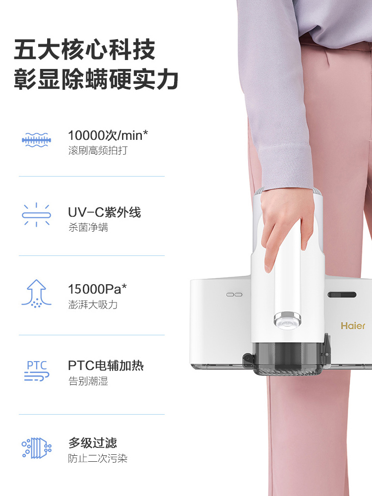 海尔除螨仪,采用双板8000次/min高频强力拍打,能高效迅速震出尘螨,12Kpa潜入式大吸力,轻松次走尘螨、毛发、皮屑等颗粒物,深度洁净,配合UV-C紫外线灯,高穿透率破坏菌螨细胞,可有效杀死99.9%的螨虫和细菌。四层过滤系统,尘气分离,避免2次污染,尘杯透明可视,可单手拆下,打理方便。