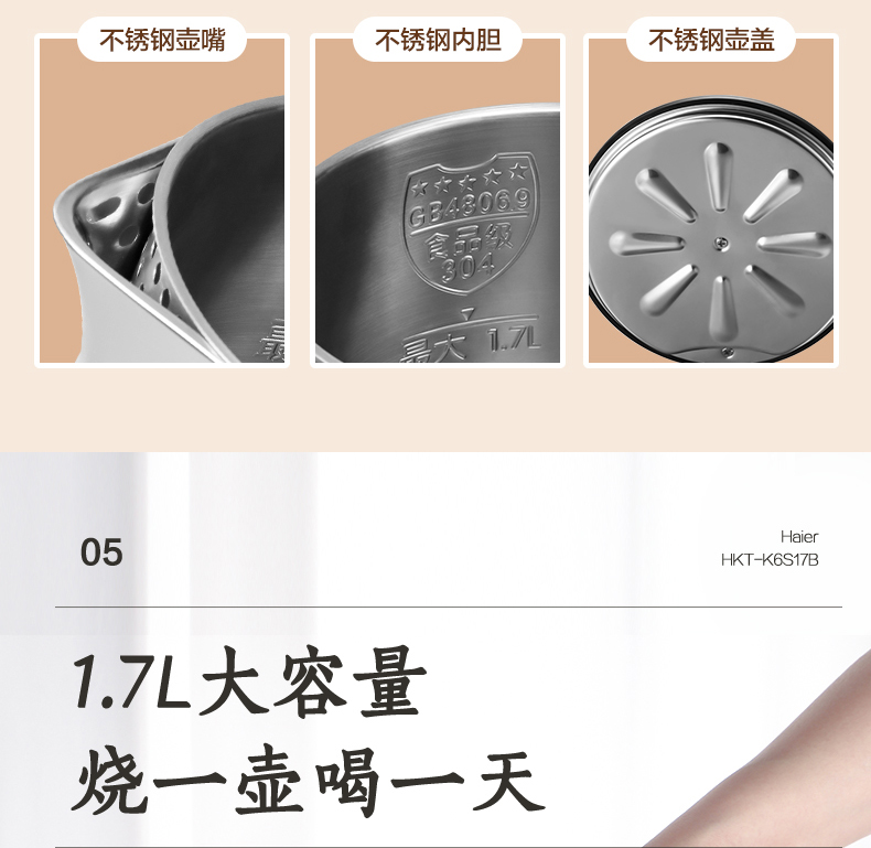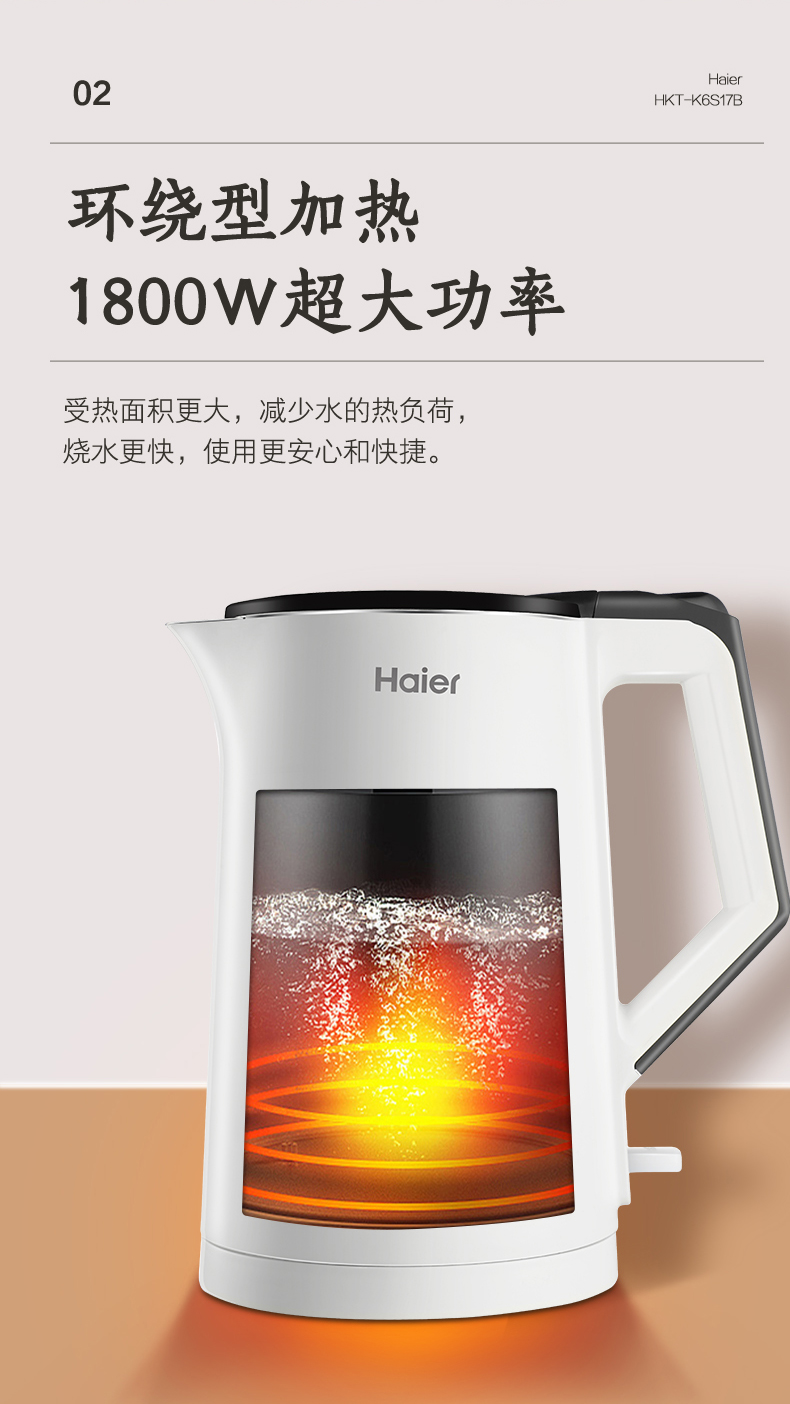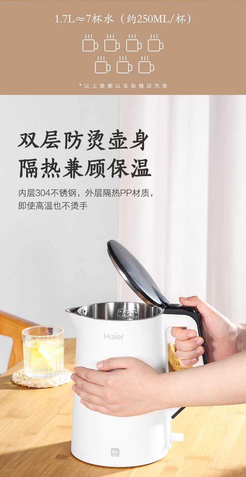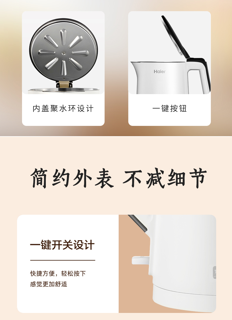 天猫海尔三丁客专卖店79元,下单立减10元,可领10元优惠券,实付59元到手,容量为1.7L,1800W快速加热,304不锈钢内胆,一体无缝设计,不易藏污纳垢,方便清洁更耐用;双层隔热防烫壶身,外层质感PP材质,保温隔热,安全防烫伤,优质控温器,准确控温,充分沸腾,全面杀菌,达到设定温度持久控温,让你畅享健康水。