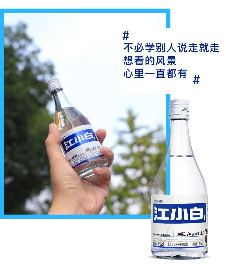 江小白,相信大家没喝过也听过,一种自然发酵并蒸馏的高粱酒品牌,每一瓶内部都有一条鸡汤语录,非常有意思,让中国白酒告别了一直追求“历史文化”的营销理念,外观新颖,口感不错,是年轻人喜欢的品牌。