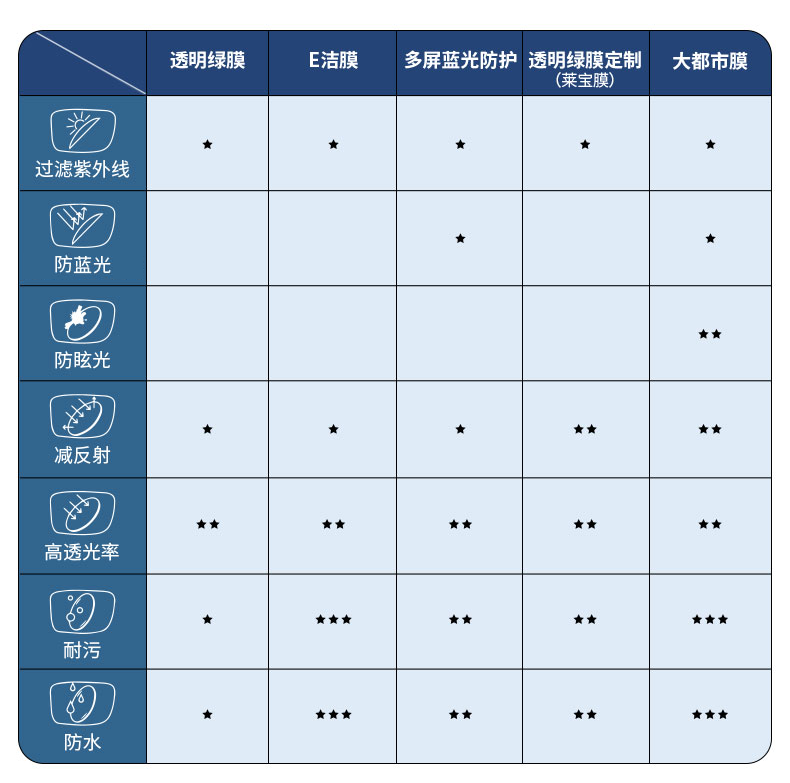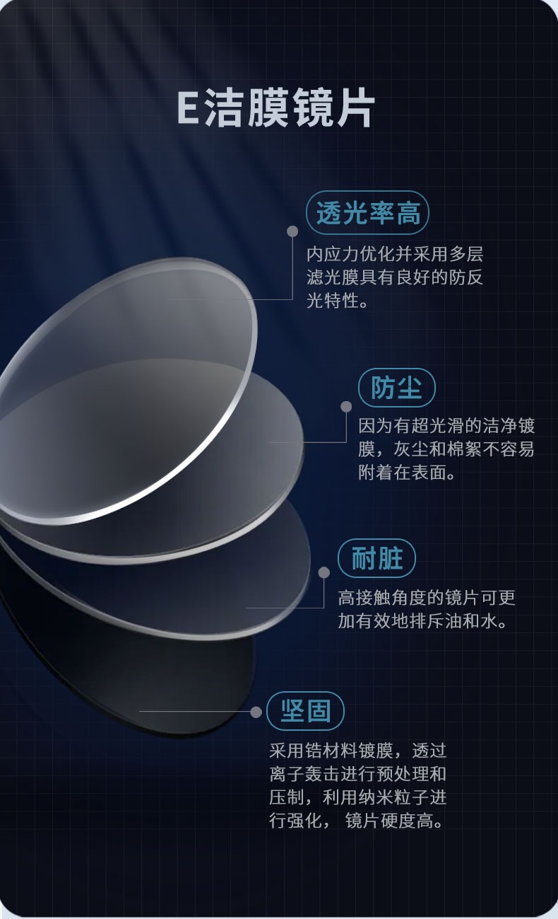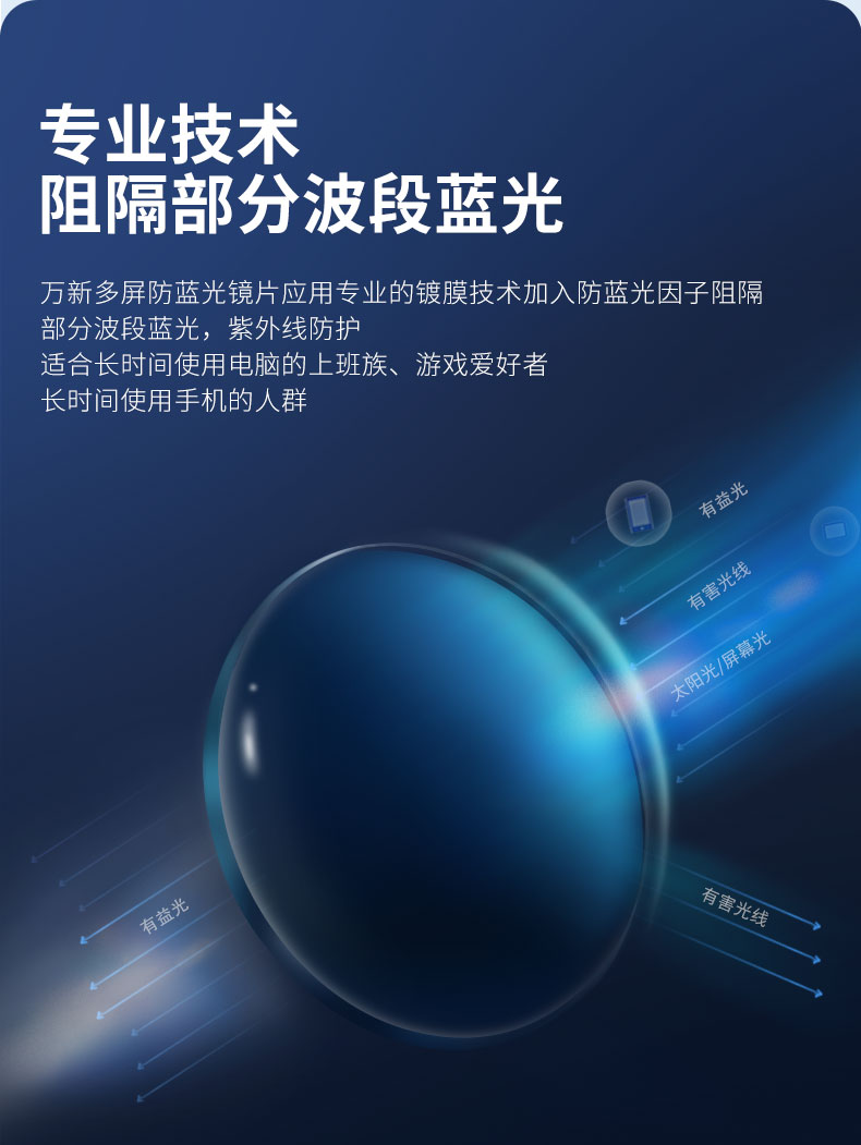 专业的镀膜技术加入防蓝光因子阻隔,部分波段蓝光,紫外线防护,变色防眩光。适合长时间使用电脑的,上班族、游戏爱好者长时间使用手机的人群。