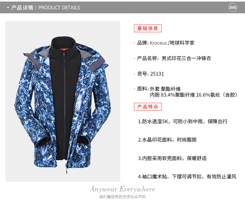 这款地球科学家的冲锋衣,外衣拥有防水透湿指数为5000,软壳内胆,无论是单穿或者组合穿都没问题。