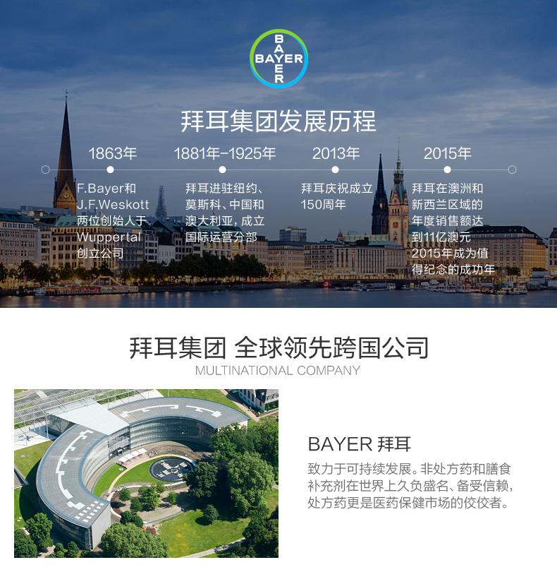 拜耳公司是世界最为知名的世界500强企业之一,公司的产品种类超过10,000种,是德国最大的产业集团。1899年3月6日拜耳获得了阿司匹林的注册商标,该药品被人们称为"世纪之药",同时也创造出了“魔鬼的杰作”世界上最大的毒品——海洛因。