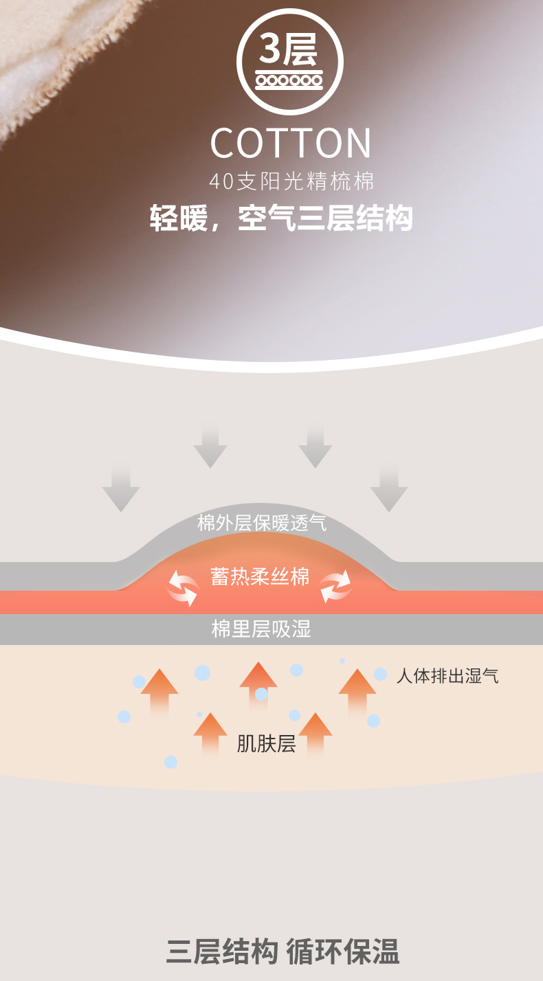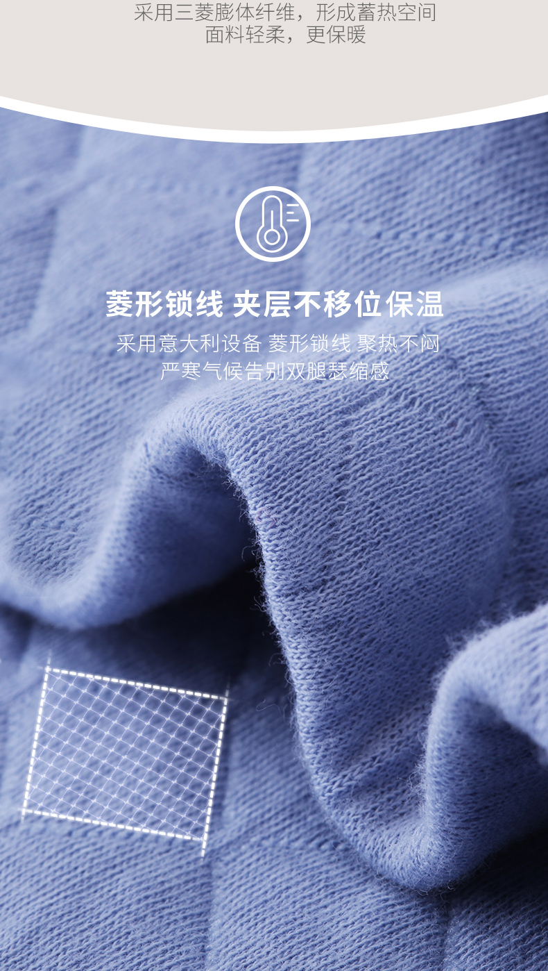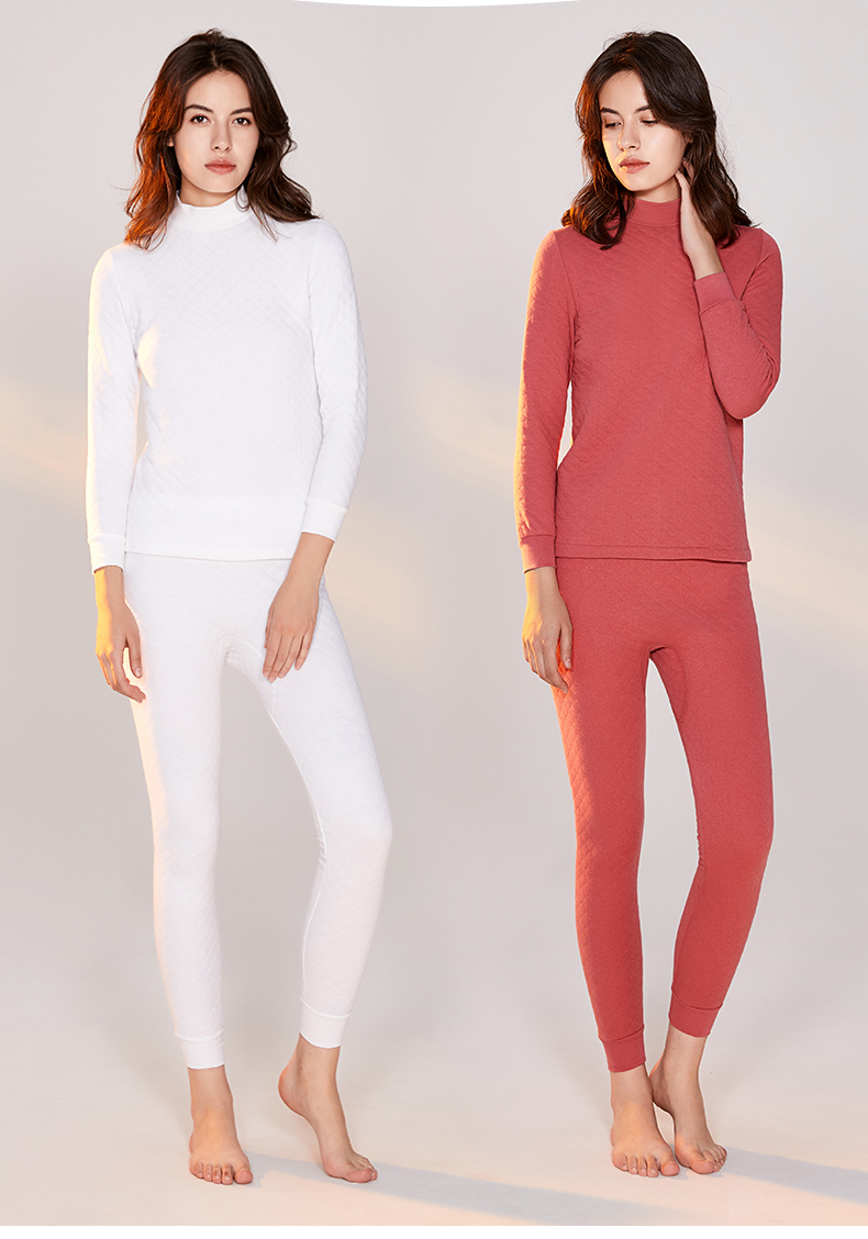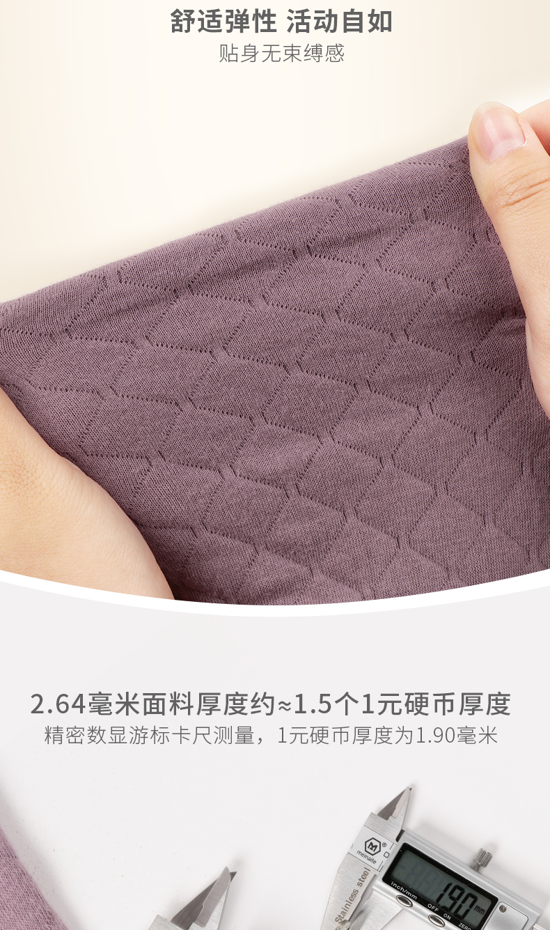 这款保暖内衣,上下两层为40支阳光精梳棉,中间层为三菱膨体纤维制成的柔丝棉,共三层结构,采用意大利设备,菱形锁线,薄厚均匀,夹层不移位,弹力针织结构自带弹力,穿着舒适,厚度约2.64mm,约1.5个1元硬币厚度,可形成蓄热空间,防寒保暖,同时亲肤透气,可排除体表湿气,穿着舒适不闷热。