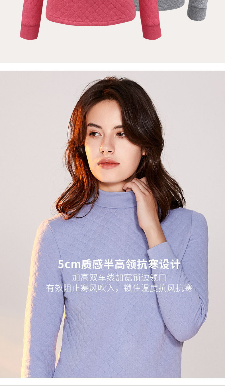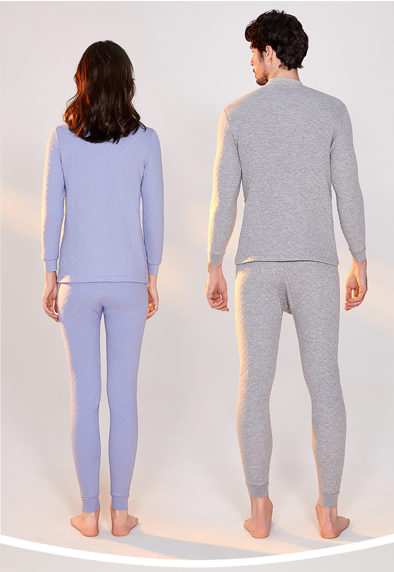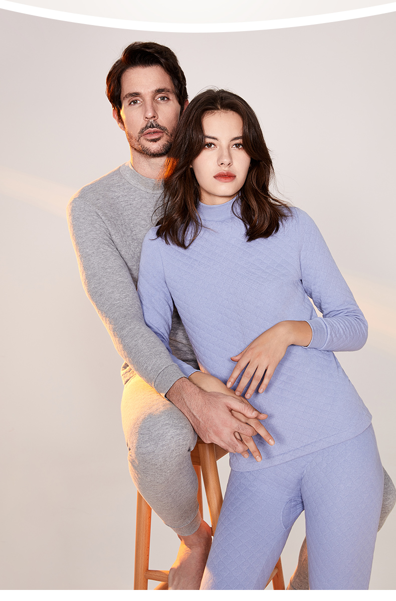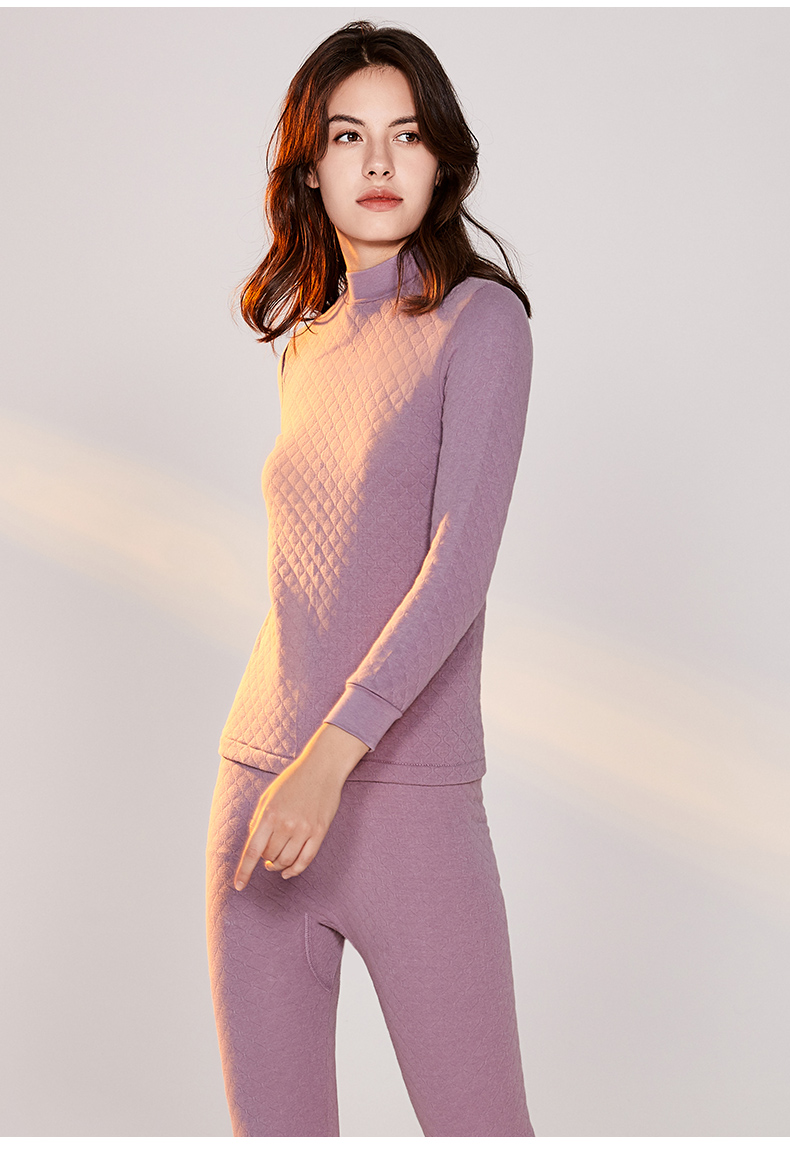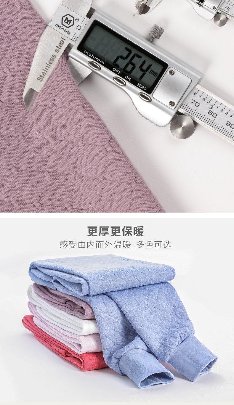 这款保暖内衣,上下两层为40支阳光精梳棉,中间层为三菱膨体纤维制成的柔丝棉,共三层结构,采用意大利设备,菱形锁线,薄厚均匀,夹层不移位,弹力针织结构自带弹力,穿着舒适,厚度约2.64mm,约1.5个1元硬币厚度,可形成蓄热空间,防寒保暖,同时亲肤透气,可排除体表湿气,穿着舒适不闷热。
