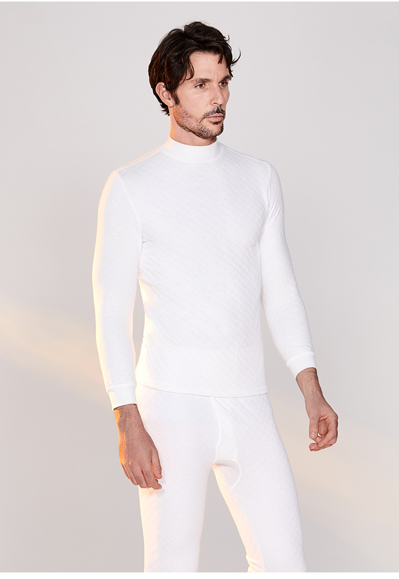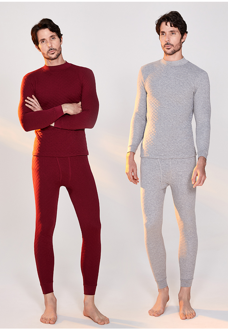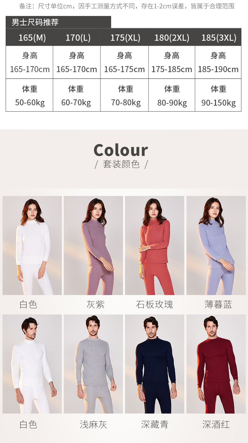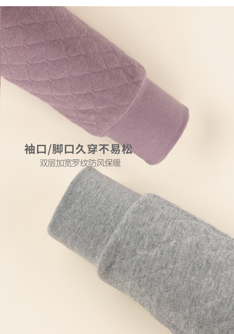 这款保暖内衣,上下两层为40支阳光精梳棉,中间层为三菱膨体纤维制成的柔丝棉,共三层结构,采用意大利设备,菱形锁线,薄厚均匀,夹层不移位,弹力针织结构自带弹力,穿着舒适,厚度约2.64mm,约1.5个1元硬币厚度,可形成蓄热空间,防寒保暖,同时亲肤透气,可排除体表湿气,穿着舒适不闷热。